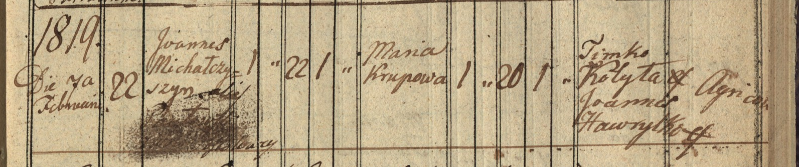 Dátum sobáša 7.2.1819 Joannes Michatczysyn - pomoc machuľa