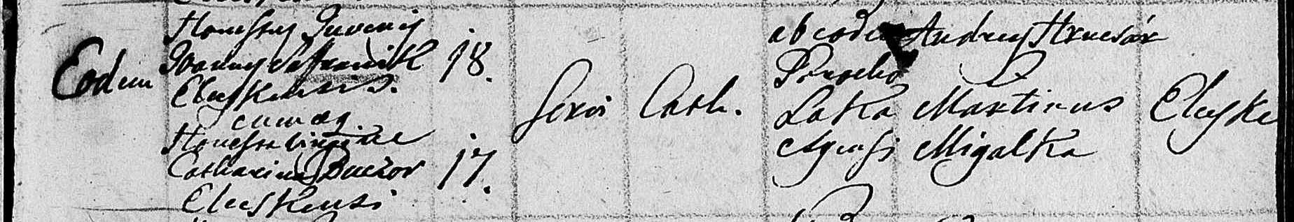 Zápis o sobáši: Eodem Honestus Juvenes Joannes Saffarcsik Elecskensis cum aeq. Honesta virgine Catharina Buczov Elecskensis. Conditio: Servi. A quo? : Ab eodem Parocho Elecskensis. Testes: Andreas Hrncsár, Martinus Migalka.