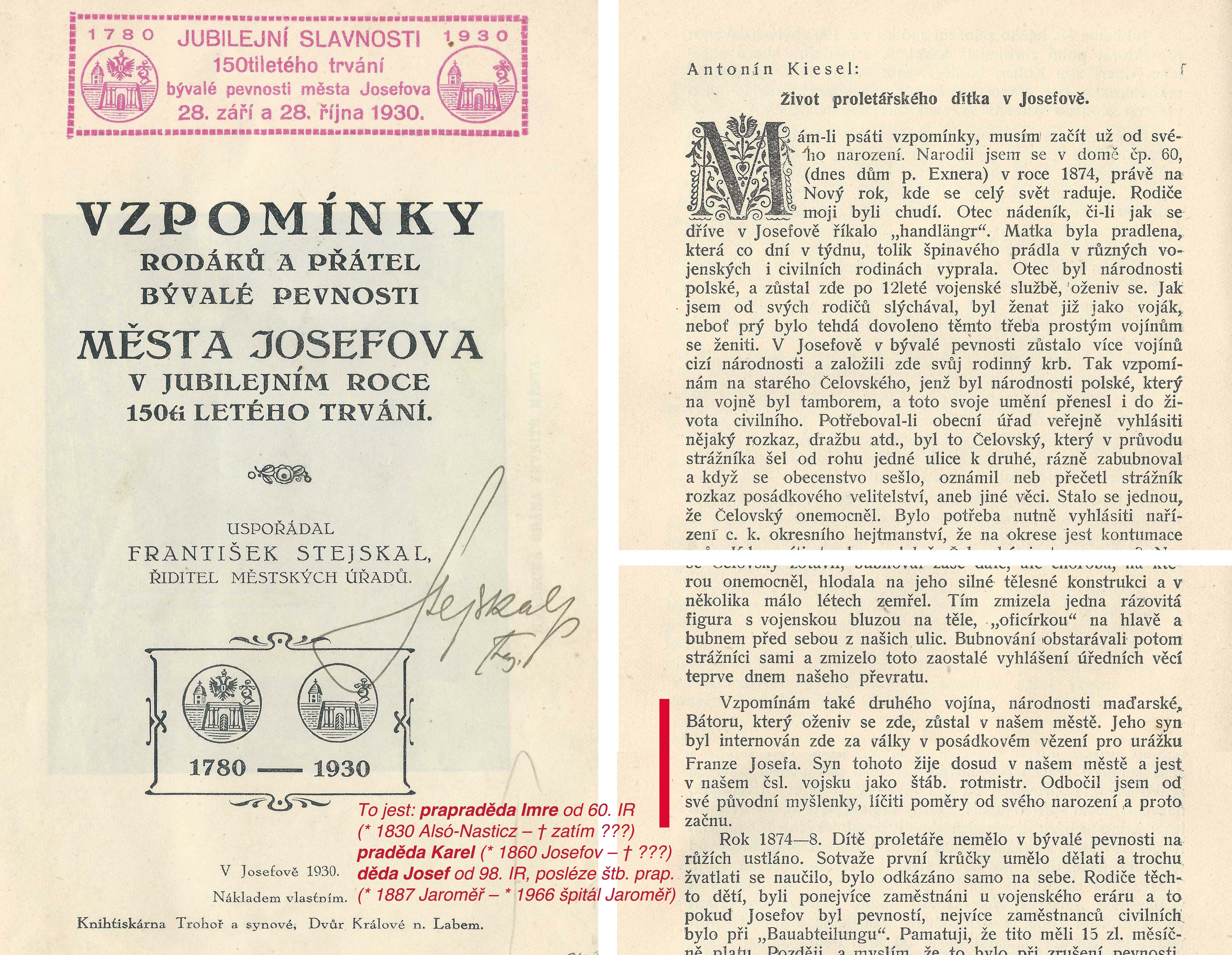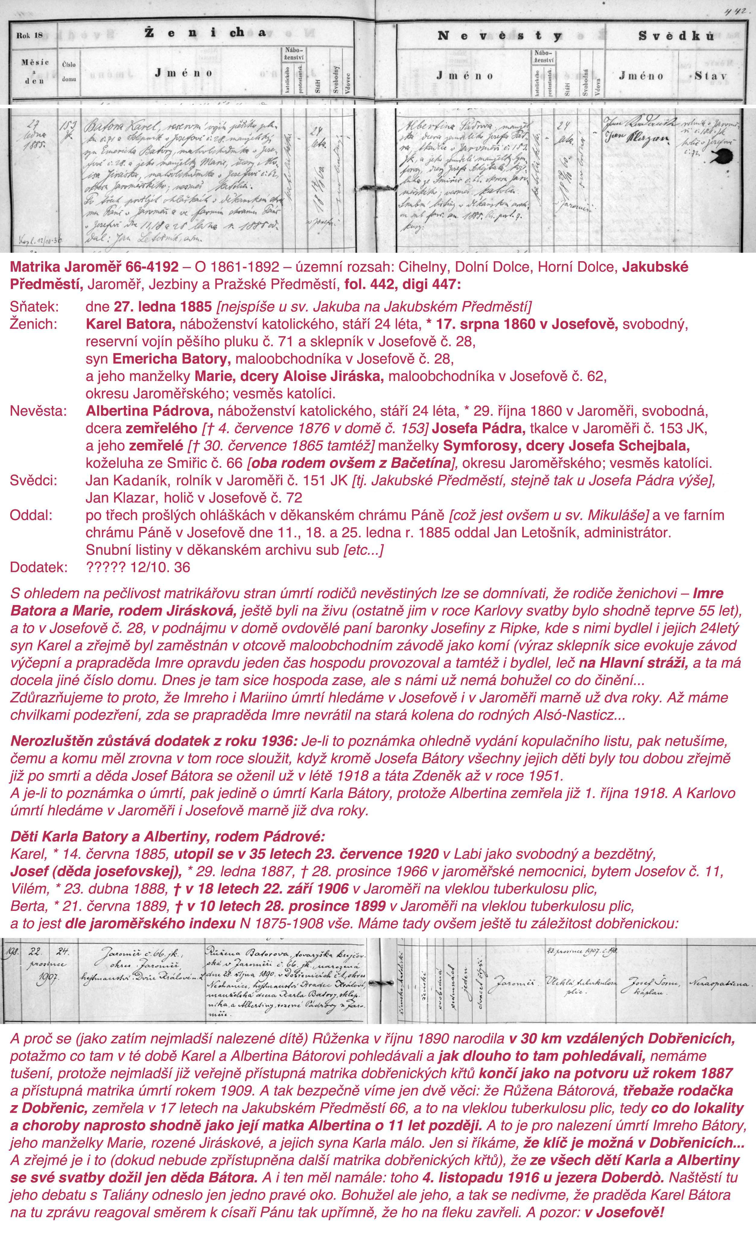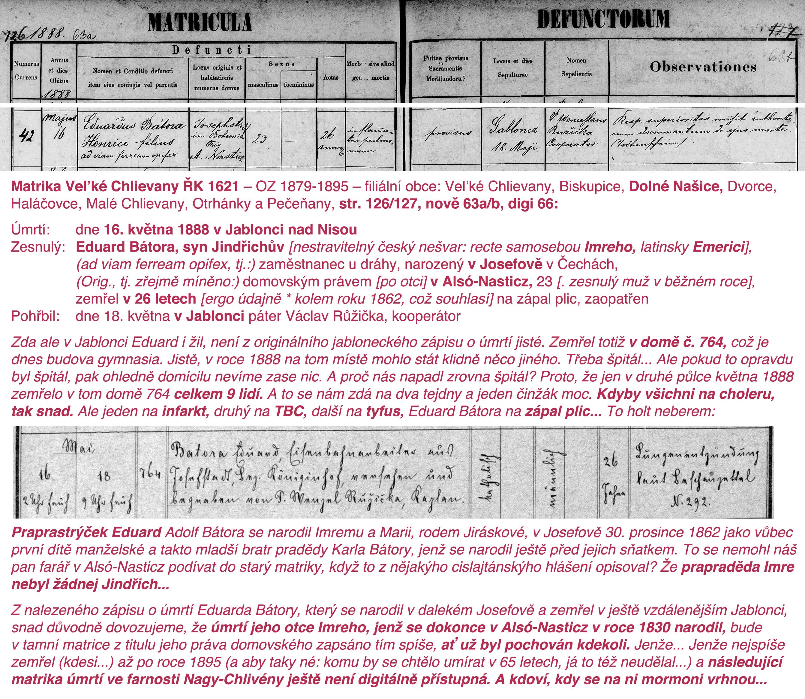 Ale nic moc, především se nejen mně, nýbrž ani jaroměřským matrikářkám (úmrtí v Josefově po roce 1905 jsou ještě veřejně nepřístupná) nedaří najít úmrtí prapradědy Emericha Bátory a jeho manželky Marie, a dokonce ani toho jejich syna Karla Bátory, který v roce 1916 zhanobil císaře.