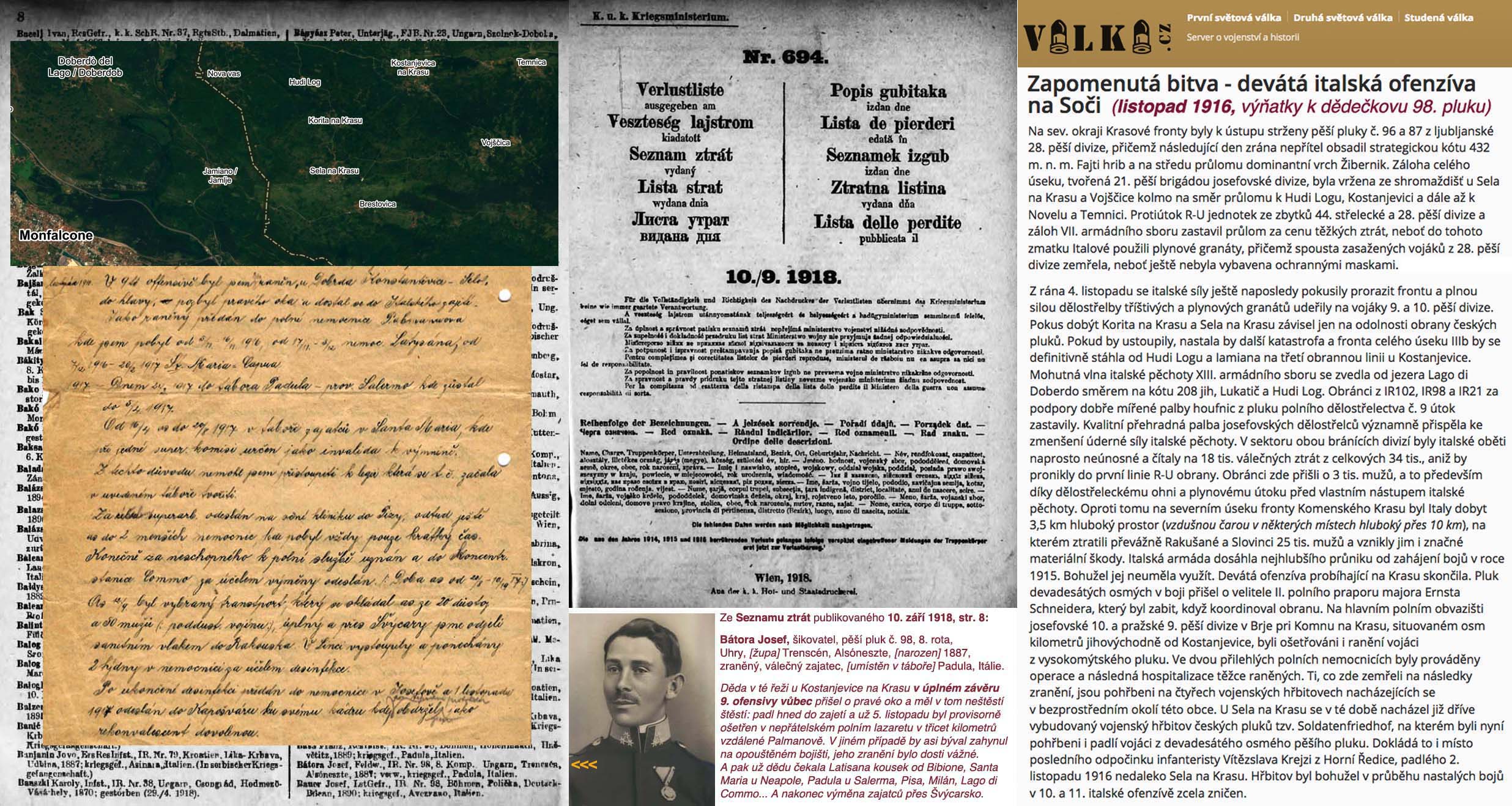 Jo, a ještě tolik, že z josefovskýho rodu Bátorů se svatby dožil jen – a to s obrovkou klikou: původně měl vykrvácet na konci 9. italský ofensivy u Kostanjevice na Krasu – děda Josef, všechny ostatní děti pradědovi Karlovi a jeho ženě Albertině, rodem Pádrové, umřely.