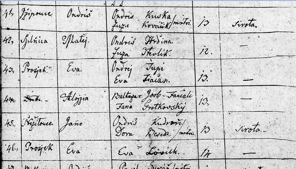 Počas uplynulého týždňa sa mi podarilo sa v tomto smere posunúť o niečo ďalej. V matrikách z Liptovskej Sielnice som nasla záznamy o úmrtí Baltazára aj Františky. Ohľadom Baltazára bola zaujímavá informácia, že sa narodil v Bielanskom (identifikáciu tohto miesta a matrík, pod ktoré by spadalo, som riešila na fóre tu - viewtopic.php?f=19&t=8540). Pri Františke nebolo písané okrem Prosieku nič, ale vek pri úmrtí presne sedel s tým zápisom o narodení dieťaťa toho mena v matrikách Toporca. Keďže v evanjelických matrikách zo Spišských Vlachov, kde jej narodenie situoval M. Szluha, sa toto priezvisko podľa slov pani matrikárky z Levočského archívu nevyskytuje, usúdila som, že hľadaná osoba by mohla byť skutočne Františka Grotkovská narodená v Slovenskej Vsi - alebo tomu aspoň všetko nasvedčuje. Ak je to tak, potom Františka by mala byť dcéra Alexandra Grotkovského a Kataríny Lányovej, vdovy po Štefanovi Doleviczenym. Pri listovaní matrikami Toporca som natrafila aj na Baltazárovych rodičov, ktorí približne v dobe, kedy by sa mal Baltazár narodiť, v Slovenskej Vsi pochovali svoju sedemročnú dcéru. Mám preto hypotézu, že Baltazár sa narodil buď po ceste z Prosieka do Slovenskej Vsi, alebo pri návrate domov - a preto to nezvyčajné miesto narodenia.