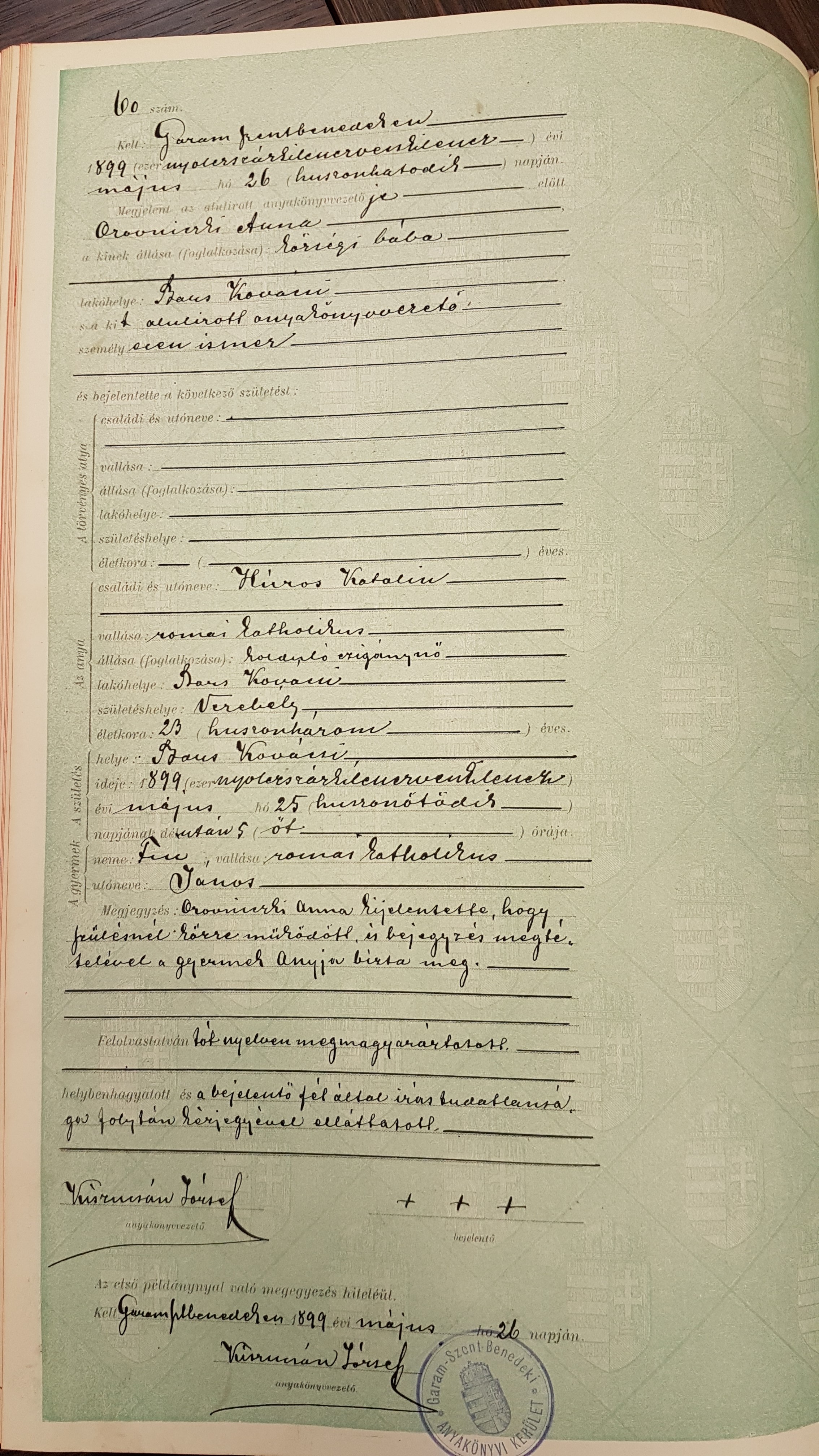 Dňa 26. mája 1899 ohlásila pôrodná baba Anna Orovnická narodenie v Tekovských Kováčoch.