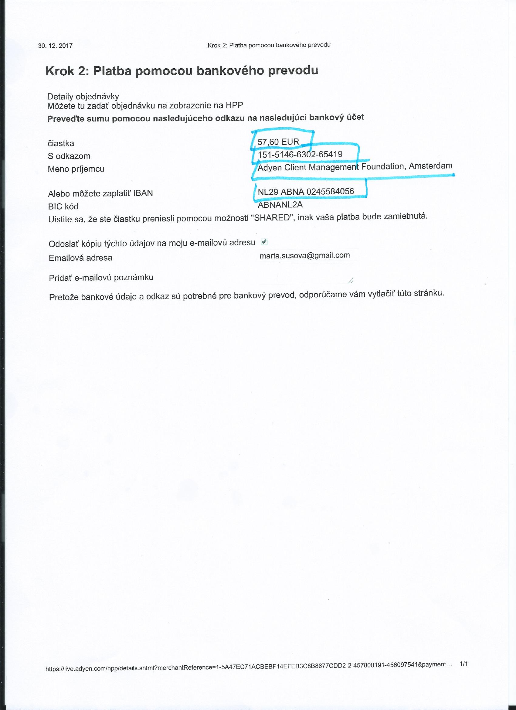 Upozorňujem na možnosť platby bankomatovou kartou, len ju označíte ako kreditnú kartu, potom stačí do kolonky číslo účtu napísať číslo karty, potom do ďalšej kolonky uviesť typ karty napr. VISA, potom si nastavíte do kedy máte platnú kartu, do ďalšej kolonky uvediete trojmiestny kód z opačnej strany karty, odsúhlasíte, následne sa vám zobrazí aby ste zadali kód, ktorý vám obratom zatelefonujú. Kód sa skladá z troch čísiel, uvádzajú číslo po čísle anglicky 3x. keď kód napíšete a odsúhlasíte máte obratom v maili potvrdenie úhrady.