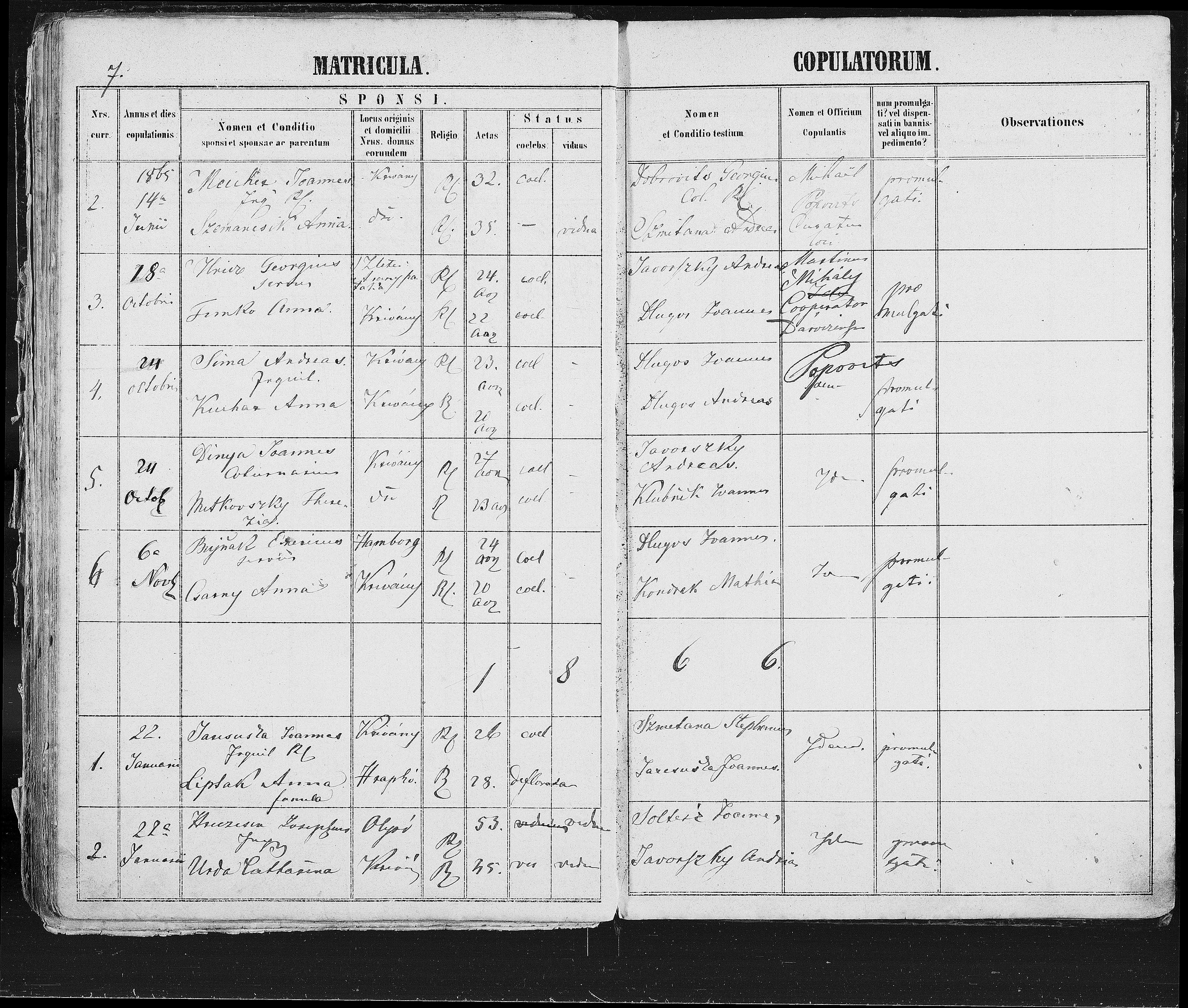 Dobrý deň, prosím o radu ako ďalej. Zostavujem rodokmeň z otcovej strany (rodiny Bujňákovej) a nemôžem sa pohnúť ďalej. Posledný známy predok je Imrich Bujňák (v matrikách napísaný ako Emericus Bujnyak alebo Bujňak). Našiel som ich sobáš s Annou Čarnou (Anna Csarni, niekde uvádzaná ako Anna Csarni Karabas) v obci Krivany (okres Sabinov). Na obrázku piaty riadok z vrchu