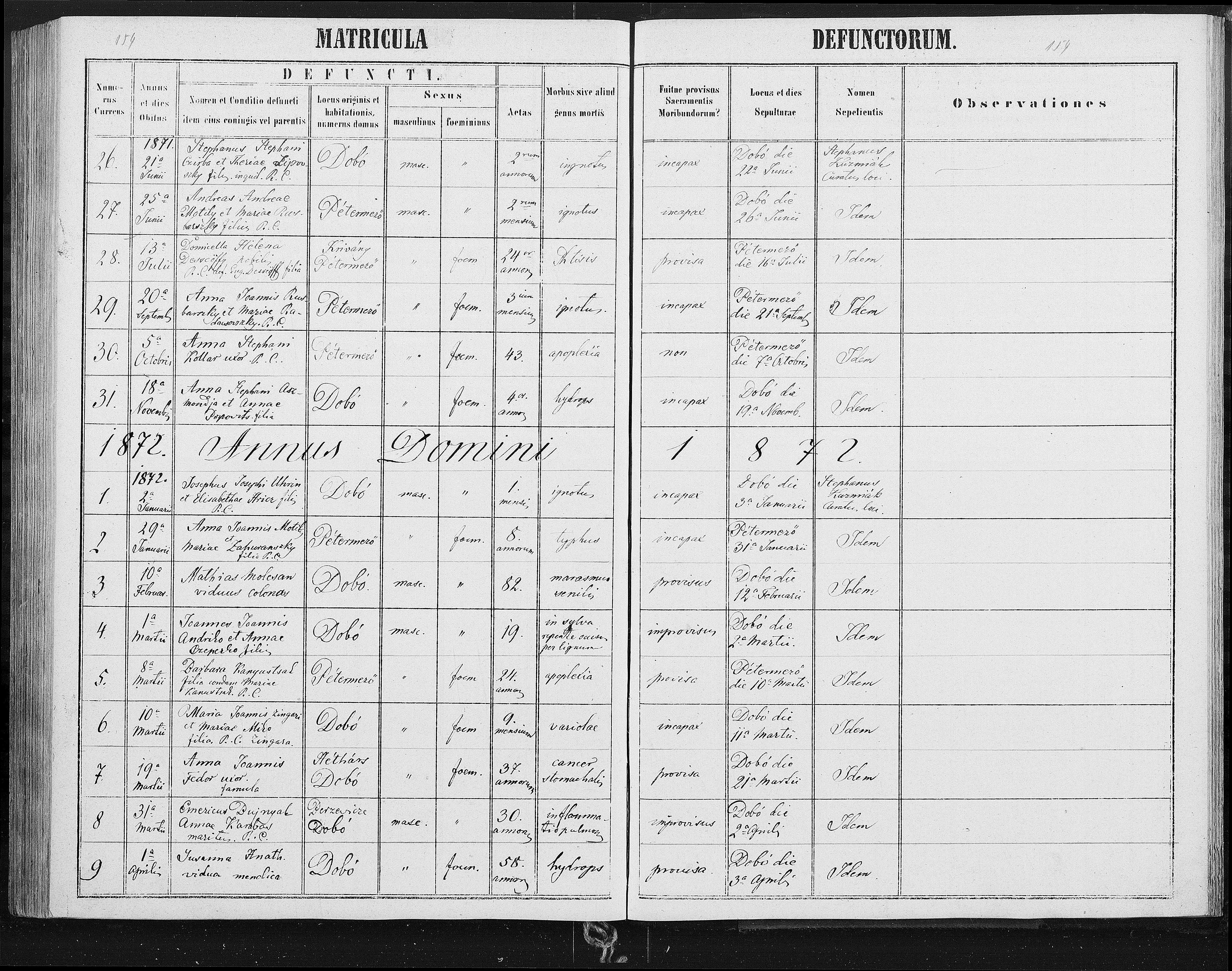 Sobáš mali dňa 6.11.1865 v Krivanoch. Píše sa tam že Imrich pochádza z obce Brezovička (Hamborg), a má 24 rokov. Čiže sa narodil v roku 1841 alebo 1842. Tak som teda išiel na matriku obce Brezovička ale tam sa žiadny Emericus Bujnyak nenarodil v uvedených rokoch. Hľadal som aj pár rokov dozadu aj dopredu ale nič som nenašiel. Potom som našiel v obci Dubovica (Dobó) zápis o jeho úmrtí dňa 31.3.1872. Na obrázku predposledný riadok v matrike