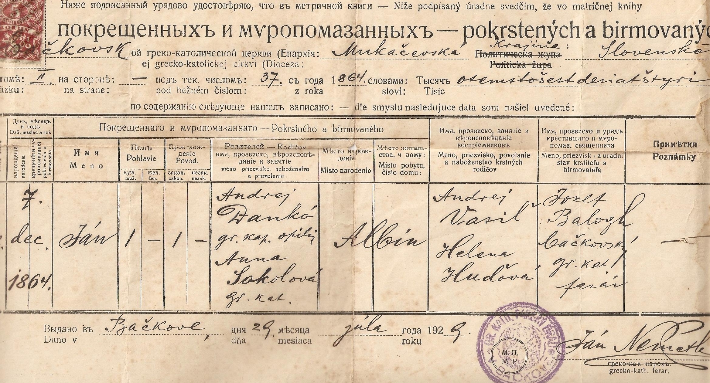 K narodeniu predka Jána Danka (1864–1956) mám ako jediný doklad rodný list – výťah z matriky vystavený gréckokatolíckym farárom Jánom Nemethom v Bačkove pri Sečovciach v roku 1929 (originál gréckokatolíckej matriky spred roku 1880 sa nezachoval a druhopis by mal byť až v archíve v Sátoraljaújhely).