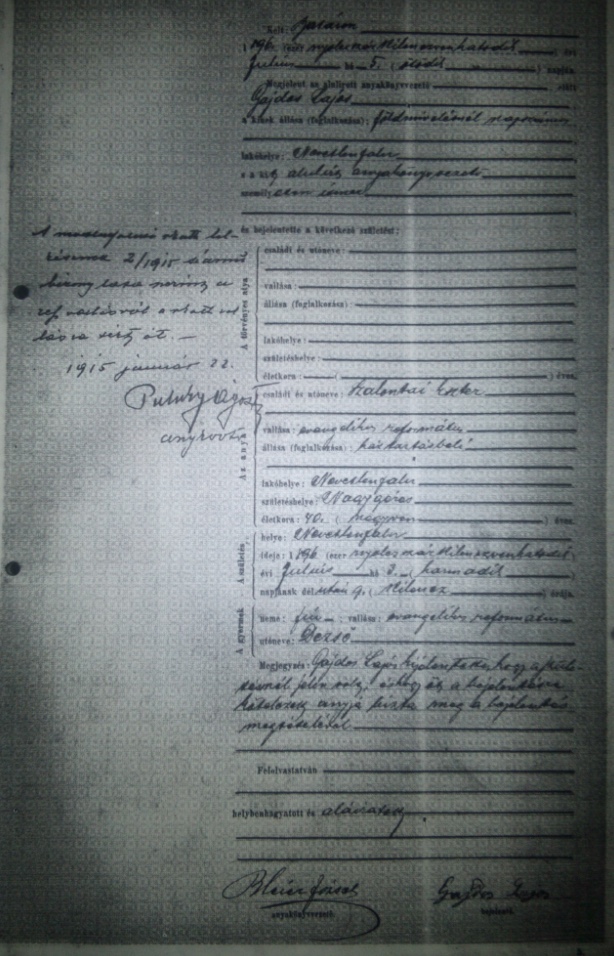 V poznámke sa píše, že Dezider Szalontai prešiel vo Februári 1915 z Reformovanej cirkvi do Rímskokatolíckej.
