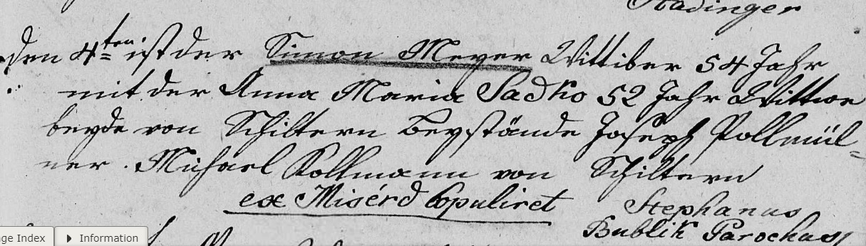„den 4ten ist der Simon Meyer Wittwer 54 Jahr mit der Anna Maria Sadko 52 Jahr Wittwe beyde von Schiltern Beystände Joseph Pollmülner, Michael Kollman von Schiltern ex Misérd Copuliret. Stephanus Bublik Parochus.“