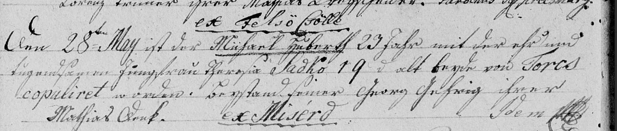 5) Dňa 28. mája bol sobášený Michal Hubert, 23 rokov starý s pannou Teréziou Satkovou, 19-ročnou, obaja boli z obce Torcs pri prítomnosti svedkov Juraja Gefriga a Mateja Denka. Obaja svedkovia boli z obce Misérd. Sobášil ten istý ako vyššie.