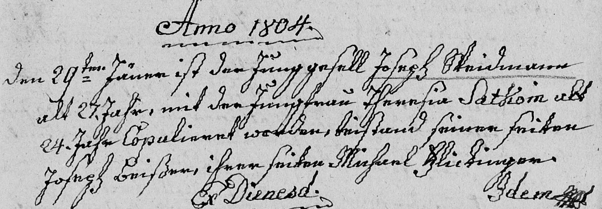 4) „Den 29ten Jänner ist der Junggesell Joseph Weidmann alt 27. Jahr mit der Jungfrau Theresia Satkom alt 24 Jahr Copulieret worden, beistand seiner seiten Joseph Beißer, ihrer seiten Michael Flickinger. Ex Denesd. Idem.“