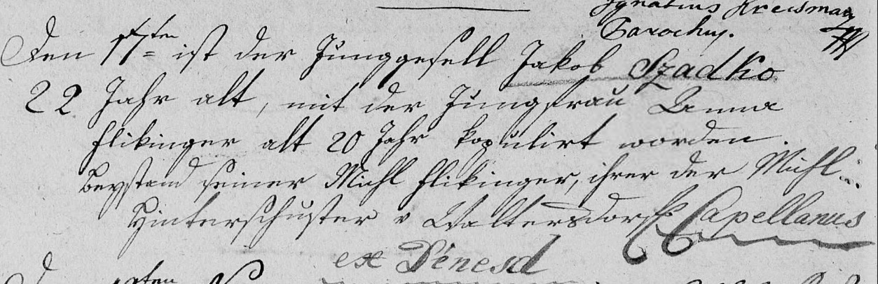3) „Den 17ten ist der Junggesell Jakob Szadko 22 Jahr alt mit der Jungfrau Anna Flikinger alt 20 Jahr kopulirt worden Beystand seiner Michael Flikinger, ihrer der Michael Hinterschuster von Waltersdorff. Capellanus ex Dénesd.“