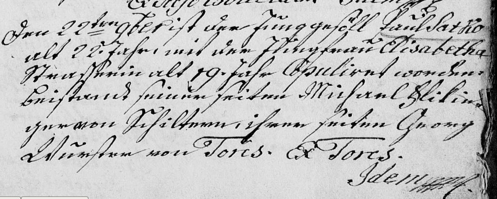 2)„Den 22ten 9ber ist der Junggesöll Paul Satko alt 22. Jahr mit der Jungfrau Elisabetha Strasserin alt 19. Jahr Copuliret worden Beistandt seiner seiten Michael Flikinger von Schiltern, ihrer seiten Georg Wurster von Torcs. Ex Torcs. Idem.“