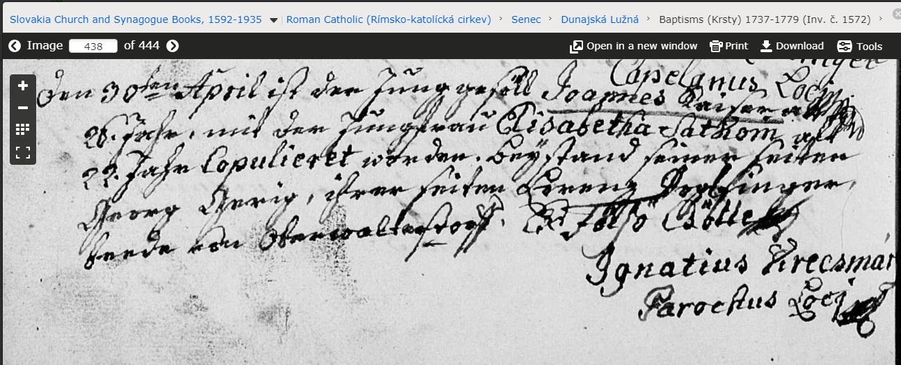 1) „Den 30ten April ist der Junggesöll Joannes Kaiser alt 26 Jahr und der Jungfrau Elisabetha Satkom, alt 223. Jahr Copulieret von der Beystand seiner seiten Georg Gerig, ihrer seiten Lorenz Doplsinger, beide von Oberwaltersdorff. Ex Fölsö Chollec. Ignatius Krecsmár Parochus Loci.“