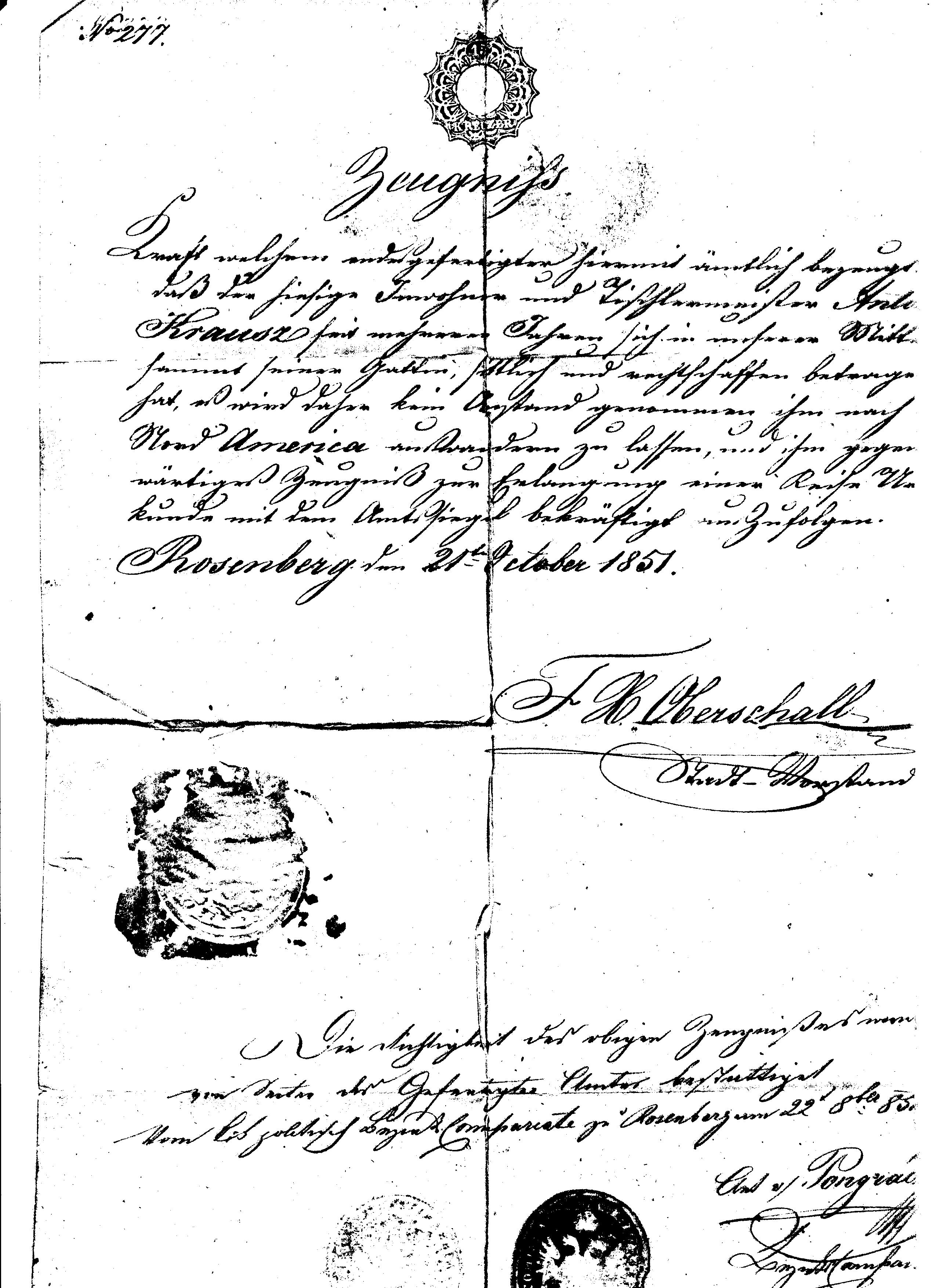 Tretí dokument by mal byť povolením vydaným dňa 21.10.1851, ktorým sa Antonovi Krausovi umožnila cesta do severnej Ameriky.