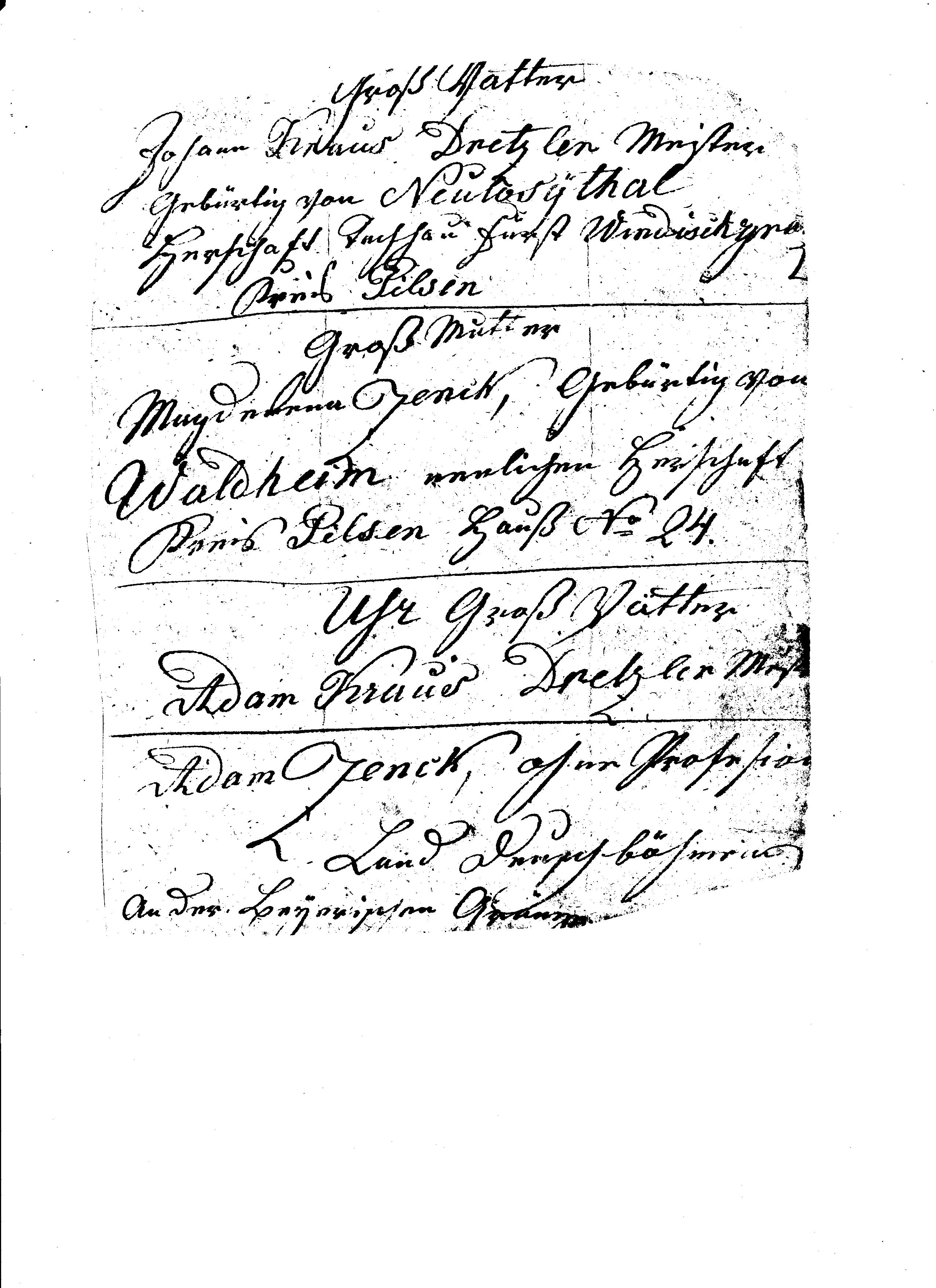 Na druhej strane text pokračuje: „Starý otec: Ján Kraus, Dretzlermeister (neviem preložiť) narodený v obci Neulosythal na panstve Tachov u kniežaťa Windischgrätza v Plzenskom kraji. Stará matka: Magdaléna Zencková, narodená vo Waldheime, Plzenský kraj, číslo domu 24. Prastarý otec: Adam Kraus Dretzler Meister a Adam Zenck bez povolania, z Čiech.“