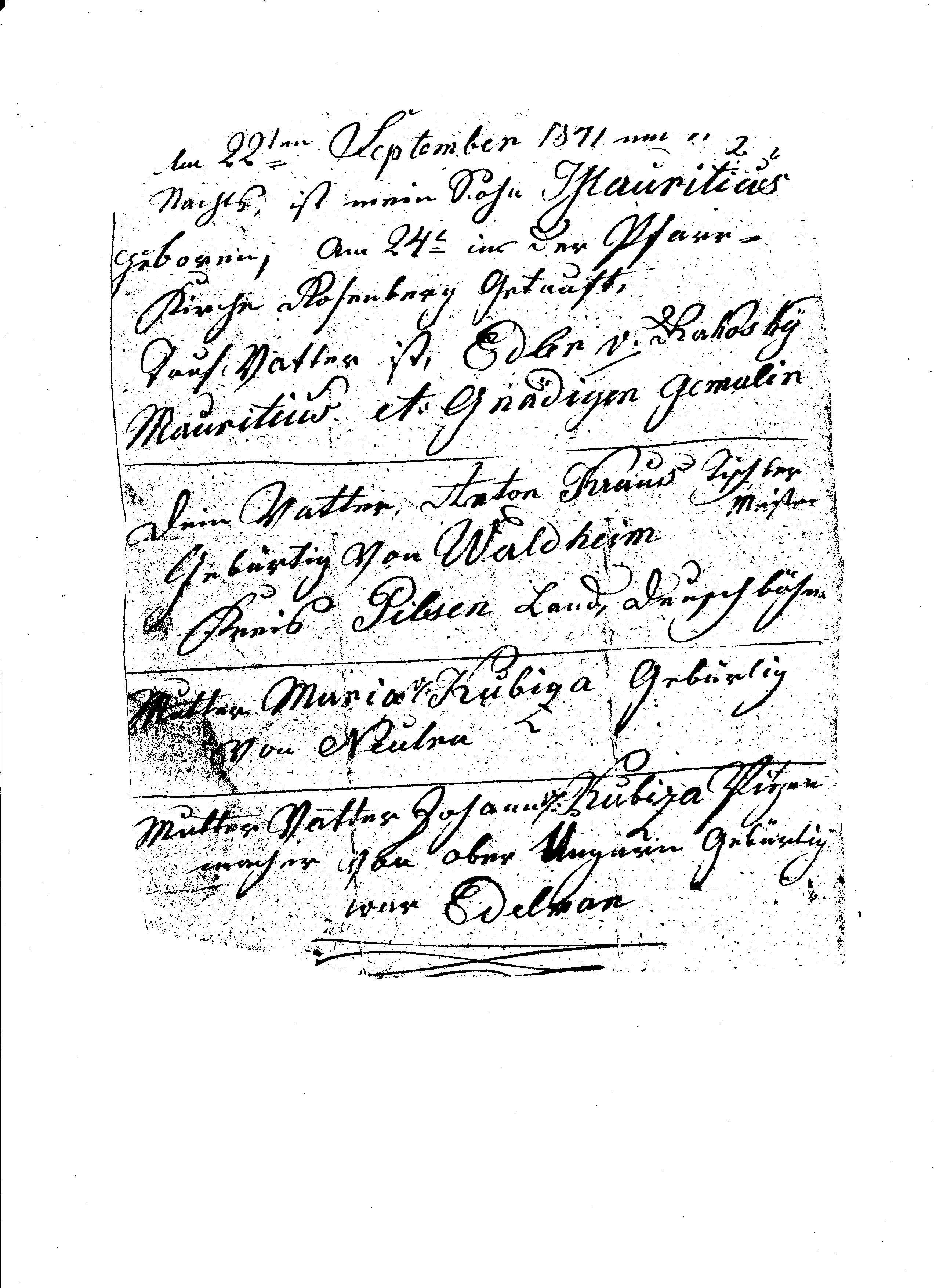 „Dňa 22. septembra 18(41? - zvyšok roku nie je dobre čitateľný) sa o 2. hodine v noci narodil môj syn Maurícius, ktorý bol 24. septembra pokrstený vo farskom kostole v Ružomberku. Krstným otcom dieťaťu bol Maurícius Edler inak zvaný Rakovský, láskavý maliar. Otcom dieťaťa bol Anton Kraus, stolársky majster narodený vo Waldheime, v Plzenskom kraji v Čechách. Matkou bola Mária Kubicová, narodená v Nitre. Matkiným otcom bol Ján Kubica, výrobca handier z Horného Uhorska“ (na konci je ešte poznámka: „bol Edelman - war Edelman“, ale tejto poznámke nerozumiem).