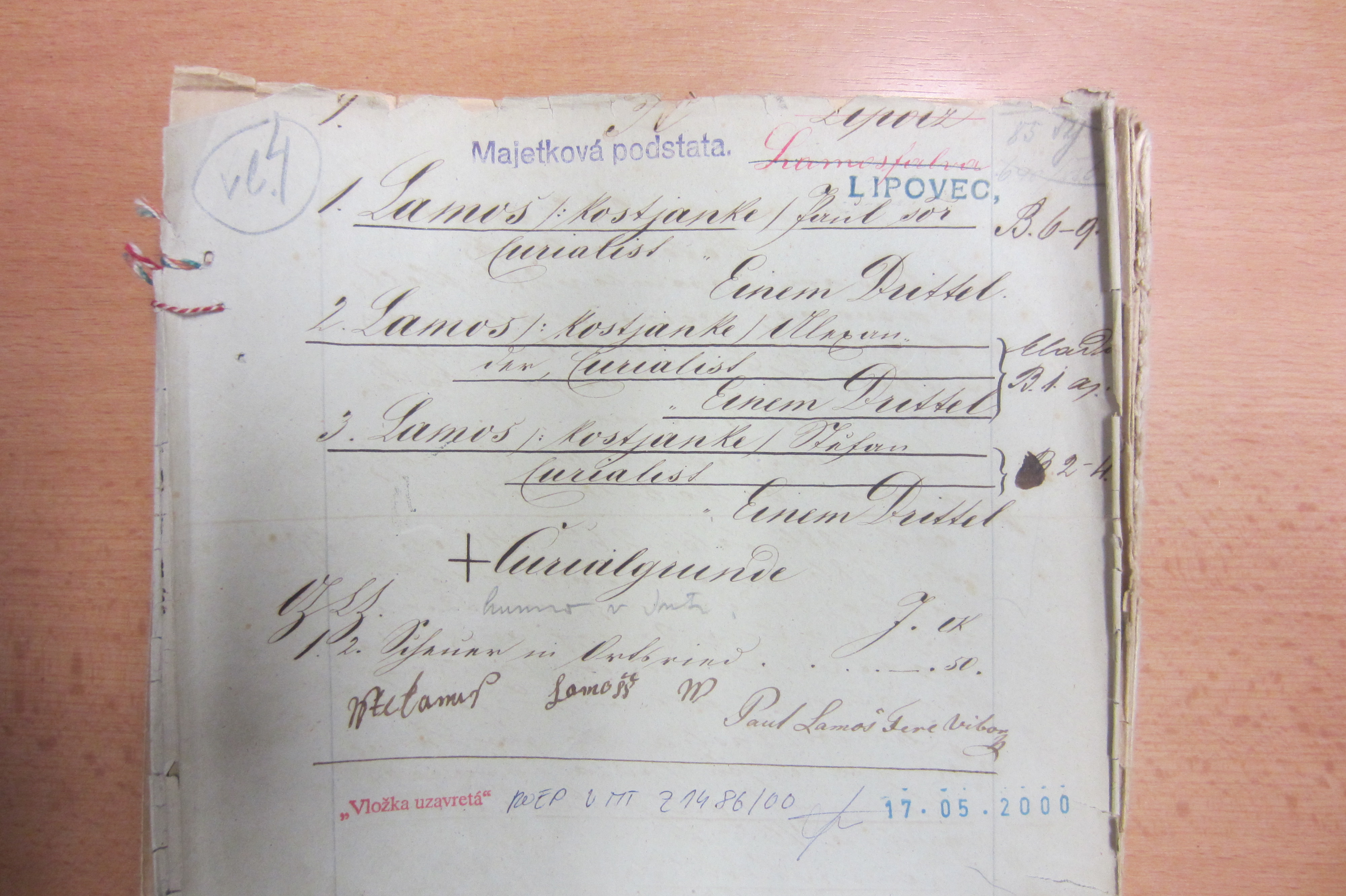Zaujal ma dokument o 3 osobách Lamoš, ale nedokážem identifikovať krstné mená a ani ďalší kontext. Rovnako som nenašla informáciu, z akého obdobia pochádza. Odhadujem niečo po r. 1886, podľa toho aké záznamy na katastry majú a toto bolo hneď na začiatku spisu.