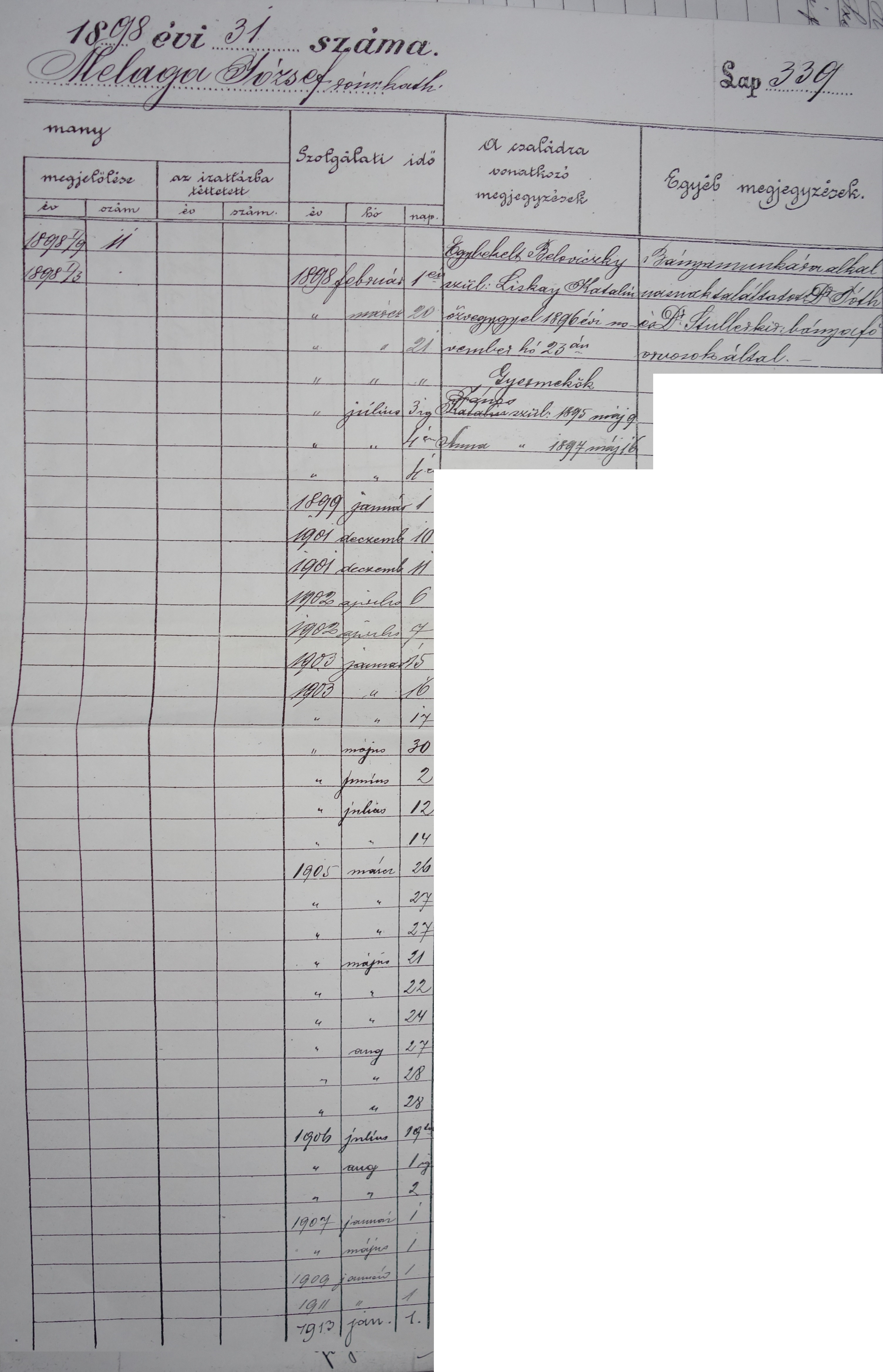 339 strana , názov dvojstránky : a szolgalati konyv - kniha sluhov - Ján Melaga zapísaný do knihy 1898 roku, 31 v poradí, rímsko-katolík