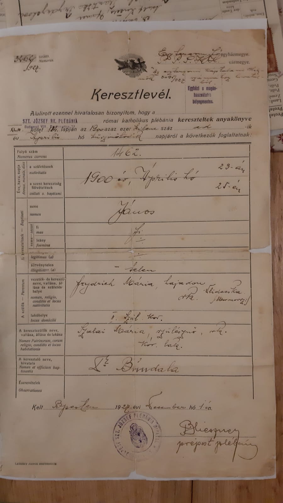 Jeho matka Mária bola narodená, resp. pochádzala z "Vlidesska" z Moravy. Bohužiaľ, neviem Vám identifikovať tú obec. Povolaním bola "napszámosnő" = nádenníčka, rímskokatolíčka, 32 ročná, žila na adrese Budapešť, VI. okres, Eötvös utca (ulica), č. domu 43.