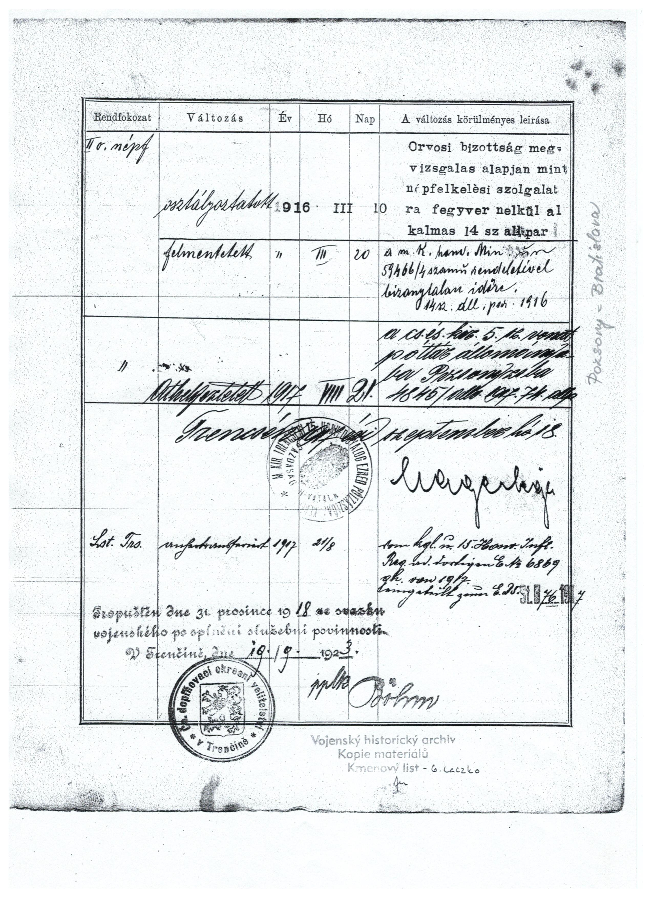 Tamtéž k datu 20.III.1916 na základě nařízení Královského maďarského ministerstva zeměbrany číslo .... byl osvobozen na