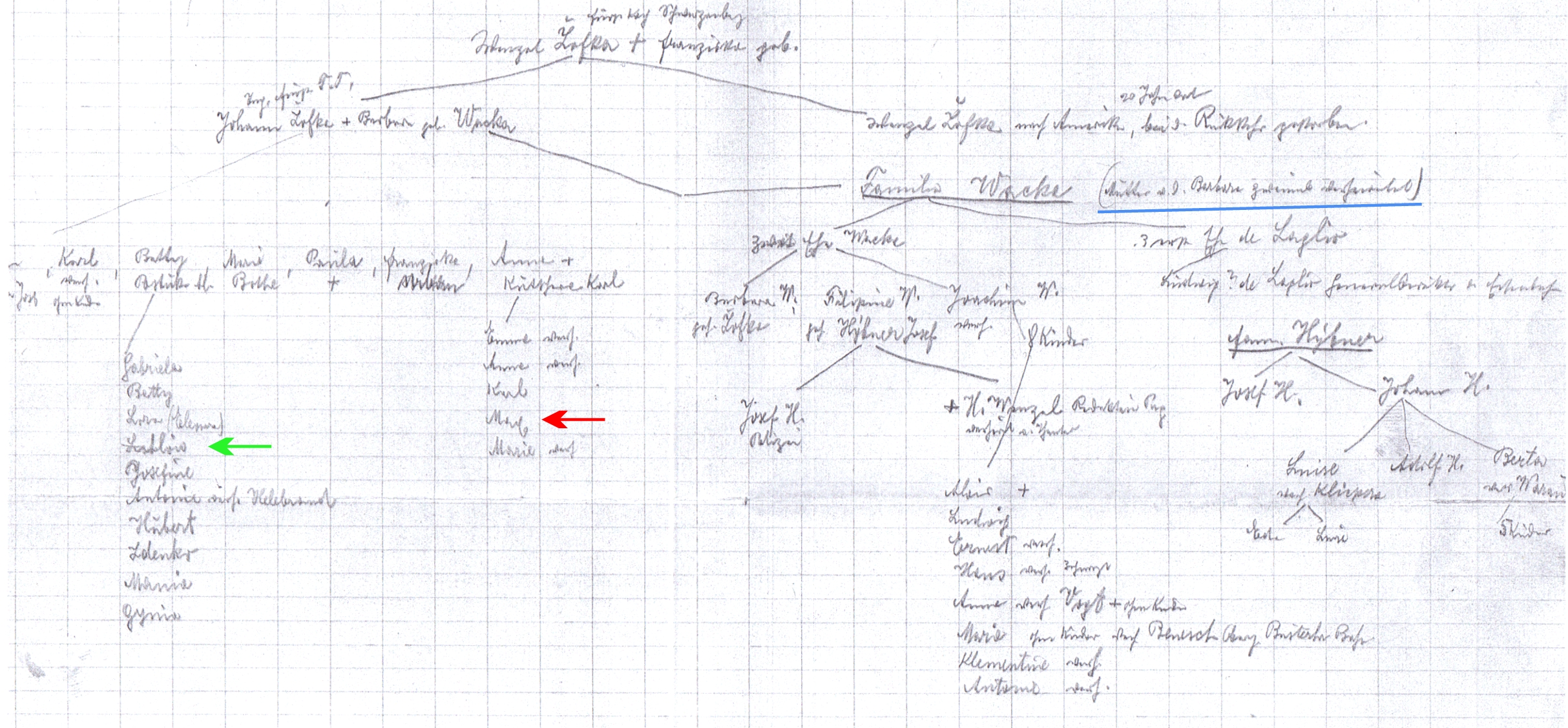 chcel by som poprosiť o rozlúštenie dvoch krstných mien a údaju v zátvorke za "Familia Wacka" (v dokumente farebne vyznačené). Je to po nemecky, mená môžu byť aj skratky či prezývky.
