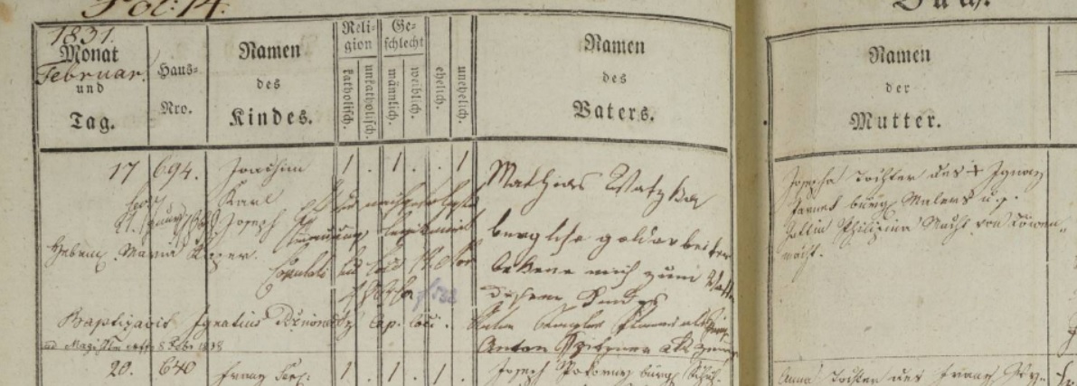 krížom cez stĺpce s vierovyznaním a pohlavím je uvedená poznámka, že dieťa bolo dodatočne legitimizované sobášom rodičov dňa 14. novembra 1834/1836/1838, nie som si istý poslednou číslovkou. V kolónke s menom otca je dodatočne uvedené, že otcovstvo dieťaťa dodatočne uznal Matej Watzka, zlatník, pri prítomnosti dvoch svedkov, pričom obaja mali krstné meno Anton a ich priezvisko neprečítam. Matkou bola Jozefa, dcéra nebohého Ignáca Jarensa, maliara a jeho manželky Filipy Machtovej z obce Löwenmacht.