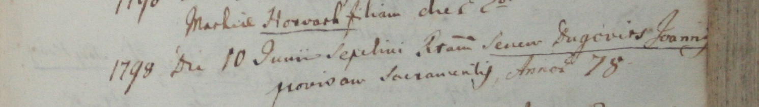 tamojší farár píše: „Dňa 10. júna 1798 som pochoval vdovu po starom Jánovi Dugovičovi, zaopatrenú všetkými sviatosťami vo veku 78 rokov.“