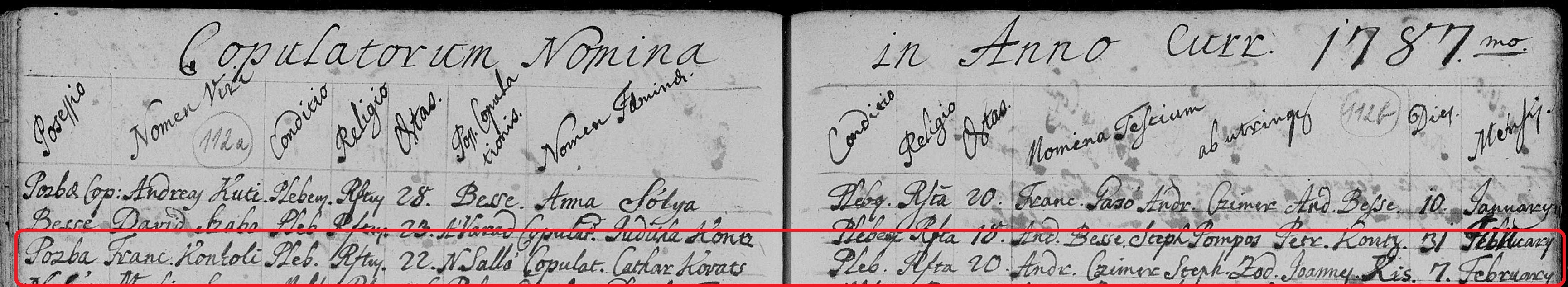 udaje, co sa mi podarilo zistit: Franciscus Konkoli, žena: Cathar ( Katalin) Kovats, zosobaseny v Pozbe 7.feb. 1787 (muz mal vtedy 22r. zena mala 20,) obaja boli reformovani.