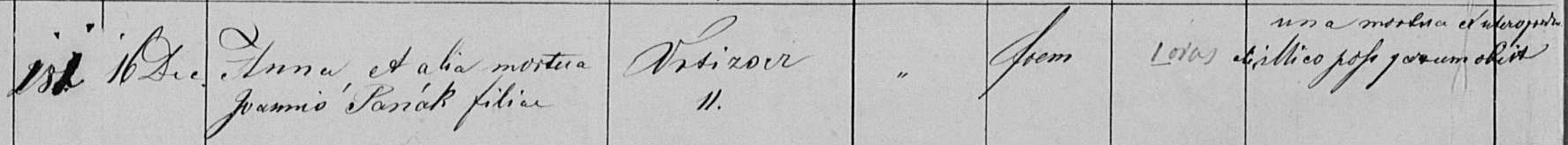 16.12 zomrela Anna, dcéra zosnulého Jána Panáka z Vrtižera 11 vo veku 1 hodina.