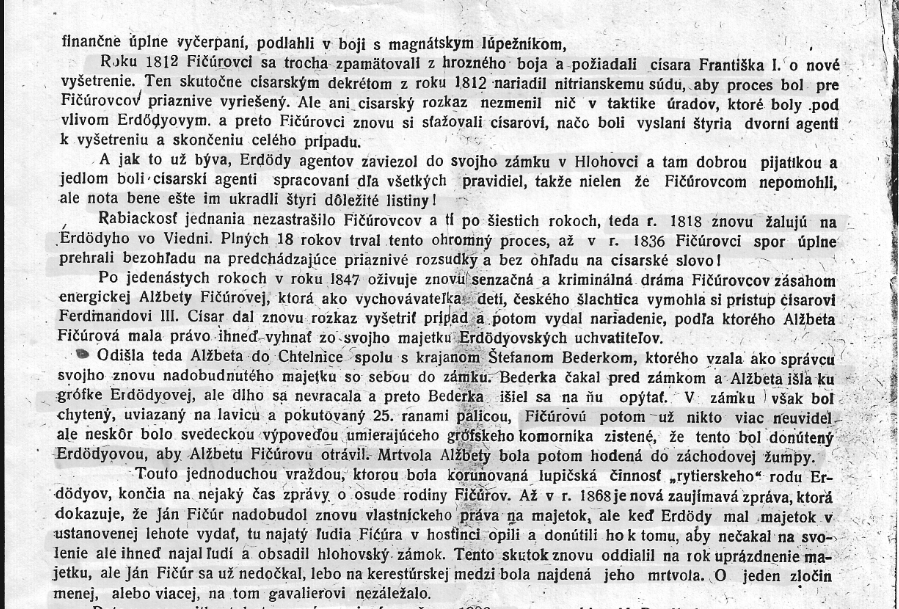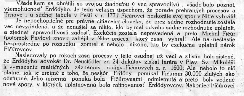 V roku 1559 František Fičura z Dechtíc od rakúskeho cisára Ferdinada I. bol povýšený do vzťahu zemianskeho a obdržal darom veľké pozemky a budovy v obvode Chetlnickom na Slovensku v cene niekoľko miliónov. Mal dvoch synov Juraja Blažeja, ktorí sa stali jeho dedičmi. Blažej zomrel ako generál v poli pri obiehaní Viedne Turkami. Juraj mal syna Pavla. Obaja padli do zajatia Turkov a boli odvlečení na Balkán. Po 13 rokoch sa vrátil už len Pavol. Bohužiaľ jeho dedičstvo bolo rozobrané cudzími ľuďmi. Jeho biedne prostriedky nestačili k dosiahnutiu svojho práva. Po 6 rokoch bolo nariadené, že každý vlastník musí preukázať k pozemkom dokumenty. Fičúrovko majektu sa zmocnil gróf Erdody a ani 40 rokov vedený proces nevymohol právo pre rodinu FIčúrovcov. Dokuemnty viedenského archívu jasne dokazujú akými prostriedkami Erdody pracoval k okradnutiu Fičúrovcov. Michal Fičúr, potomok Pavla znovu zahájil proces v Nitre, ktorý vyhral. Bezprostredne po po rozsudku zomrel a nenašiel sa nikto, kto by exekučne uplatnil nárok Fičúrovcom. Po rokoch nasledovali procesy a z listín bolo zistené, ze advokát Dr. Neustodler za 24 dukátov získal farára v Plaveckom Svetom Mikuláši k vymazaniu matričných záznamov rodiny Fičurových z roku 1600. Neskôr Erdody ponúkol Fičúrovcom 30000 zlatych ako odstupne. Ponuka bola odmietnuta. V roku 1812, poziadali Ficurovci cisara Frantiska o nove setrenie. Styria dvorni agenti, kotri mali vysetrit cely pripad skoncili v Hlohovci na zamku u grofa Erdodyho. Kde boli uplateni dobrym jedlom a pijatikou a este k tomu im aj ukradli vsetky listiny. V roku 1818 Ficurovci znovu podali zalobu. Tento proces trval do roku 1836 s nepriaznivym rozsudkom. V roku 1847 Alzbeta Ficurova (mala by to byt prababicka mojej prababicky) ozivuje tento proces. Vymohla si pristup k Ferdinandovi III. Ten vydava rozkaz vysetrit cely pripad, Konci to tak, ze Alzbetka ma v rukach nariadenie s pravom vyhnat zo svojho majetku grofa Erdodyho.