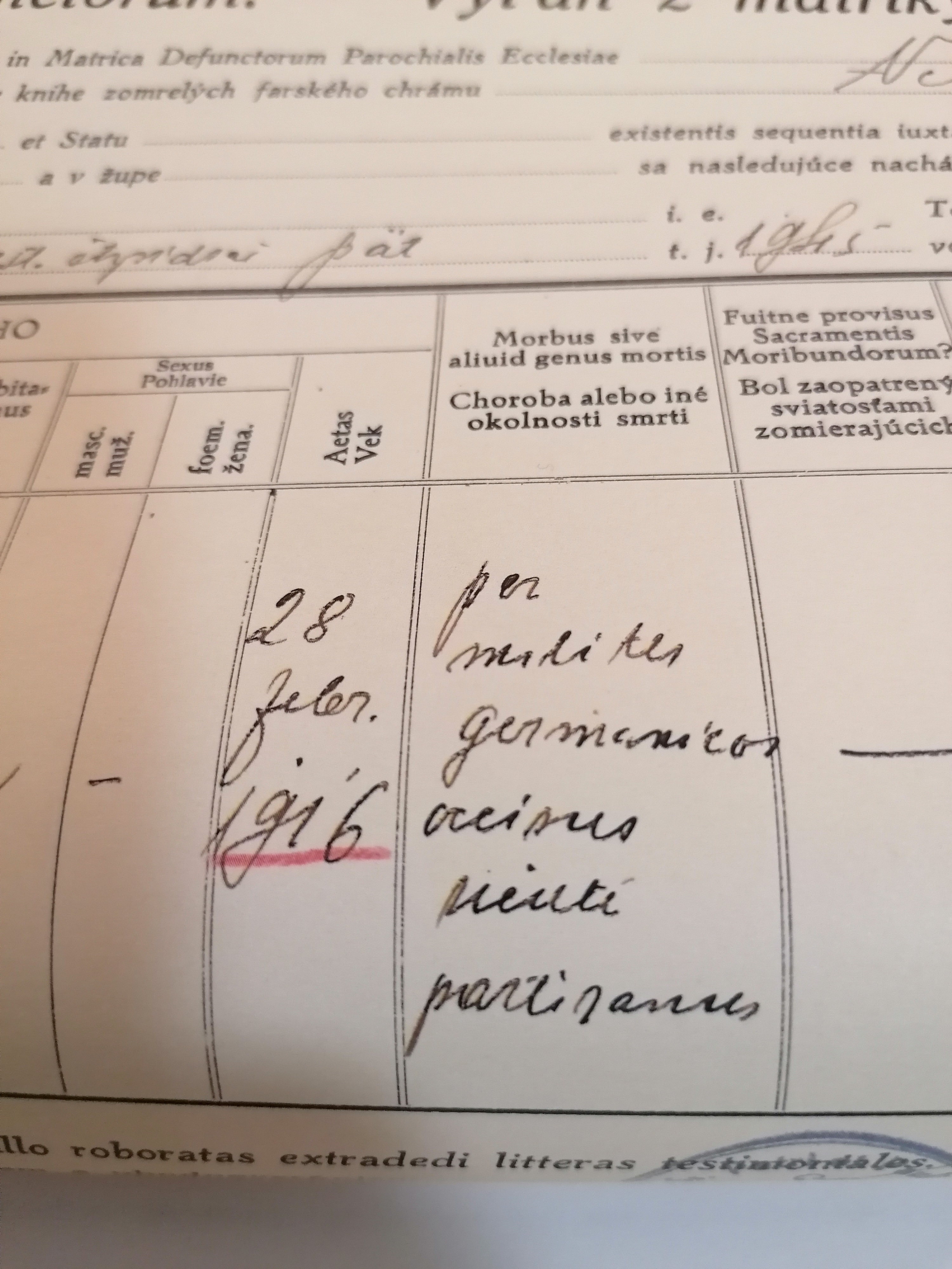 Brat môjho deda bol v partizánskej skupine a padol v boji proti nemeckým nacistom. V kmeňovom liste z vojenského archívu má priložený úmrtny list, kde mu kňaz v kolónke príčina smrti uviedol poznámku, ktorú neviem úplne presne preložiť.