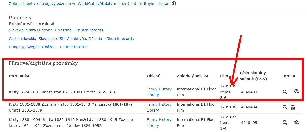 Vyhľadanie mikrofilmu cez číslo (bez podtržníka a čísla za ním), je na snímku 1. Na snímku dva je vidieť, z čoho sa mikrofilm skladá (označenie farností a čísla/časti, na ktorých sa nachádzajú). Na snímku 3 je vidieť označenie konkrétnych častí na uvedenom mikrofilme. Celkom vpravo je ikona mikrofilmu a nie fotoaparátu, čo znamená, že film nie je online dostupný, takže si ho z domu nepozriete, ale musíte ísť do archívu.