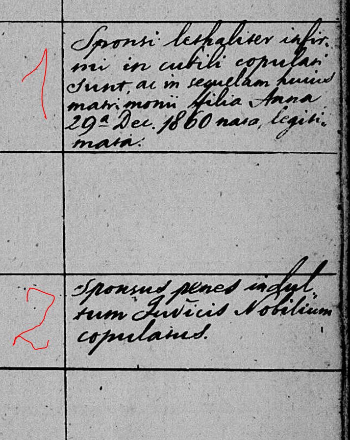 1. Sponsi lethaliter infirmi in cubili copulati sunt, ac in sequelam huius matrimonii filia Anna 29a Dec(embris). 1860 nata, legitimata. Snúbenci sú smrteľne chorí, preto boli zosobášení vo svojom dome a v dôsledku sobáša bola dodatočne legitimizovaná ich dcéra Anna narodená dňa 29. decembra 1860.