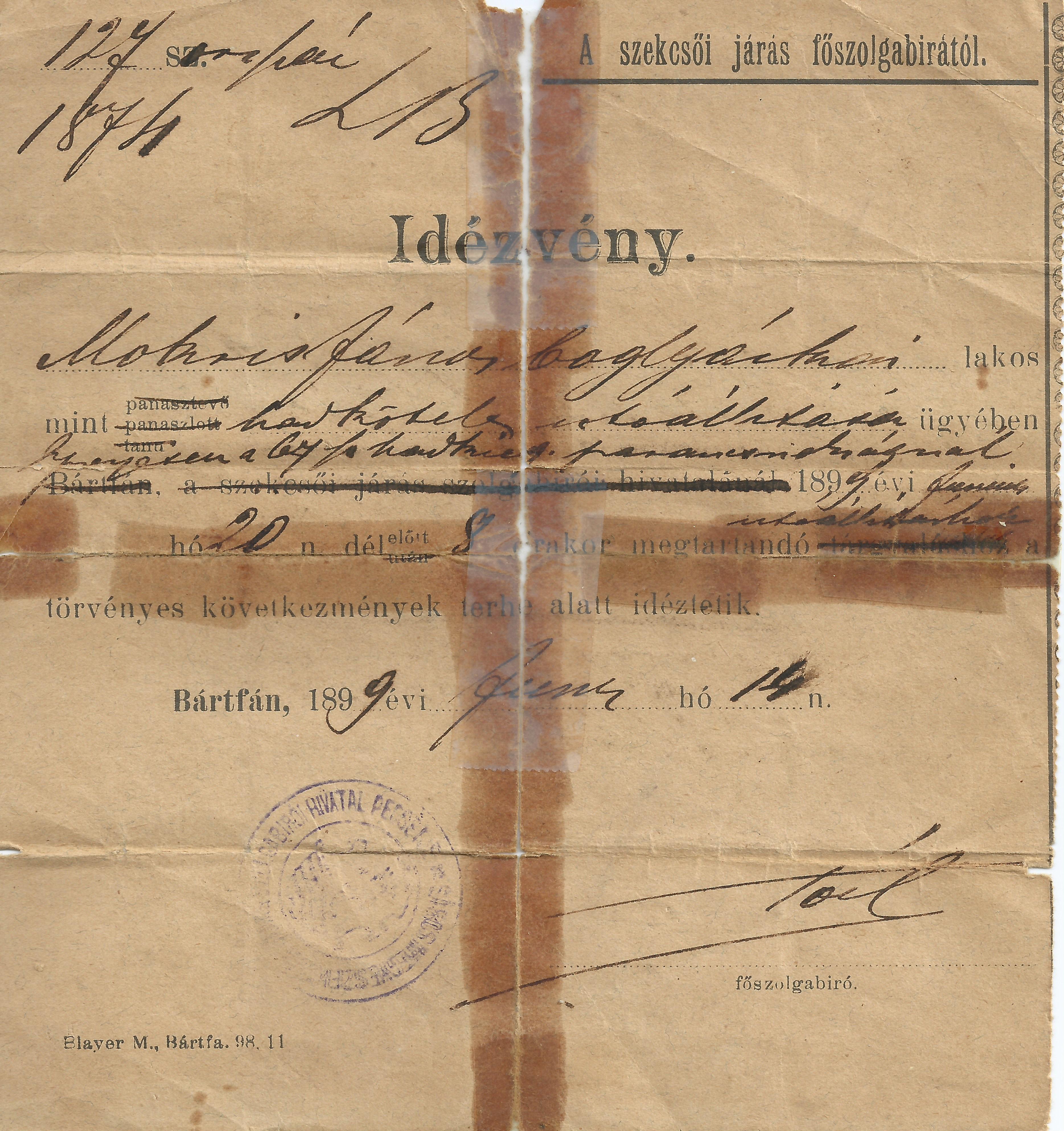 Maďarský text: "Mokris János boglyárkai lakos mint hadköteles előálítása ügyében ... hadkieg (hakiegészítő) parancsnokságnál".