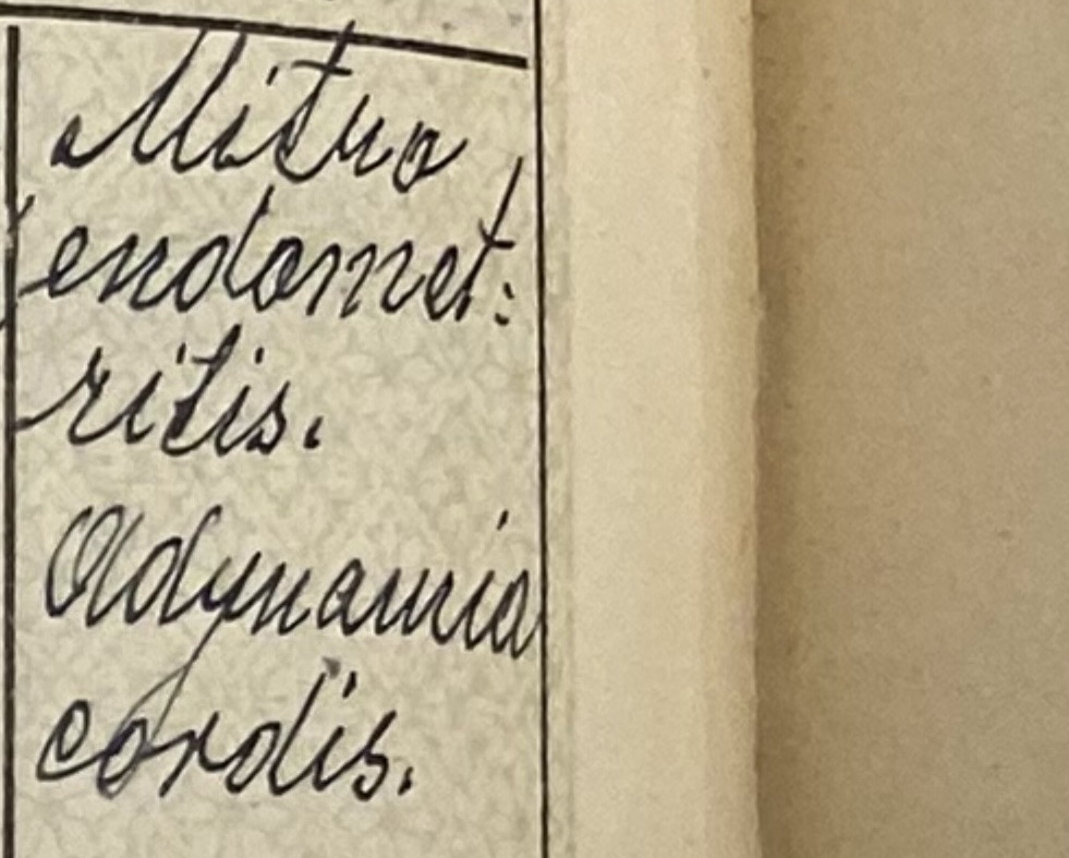 na danom obrázku sú uvedené slová: „Mitroendometritis. Adynamia cordis“ Metroendometritída predstavuje zápal vnútornej výstelky (epitelu) a svalu maternice, adynamia cordis zrejme v tomto prípade predstavuje srdcovú slabosť spojenú s nedostatočným výkonom srdca.