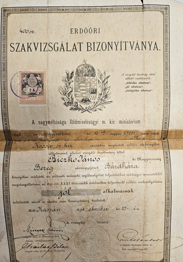 Vysvedčenie o Lesníckej skúške pre Jána Bicka narodeného v Barbove s hodnotením dobrým, vydané Ministerstvom Pôdohospodárstva v Košiciach zo dňa 2.10.1898.