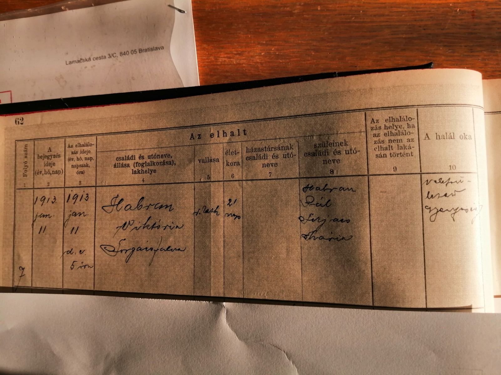 dieťa zomrelo dňa 11. januára 1913 o 5. hodine ráno (maď. 1913 jan[uáriushó] 11 d[él] e[lött]. 5 óra). Príčinou smrti bola vrodená slabosť (maď. veleszületett gyengeség).