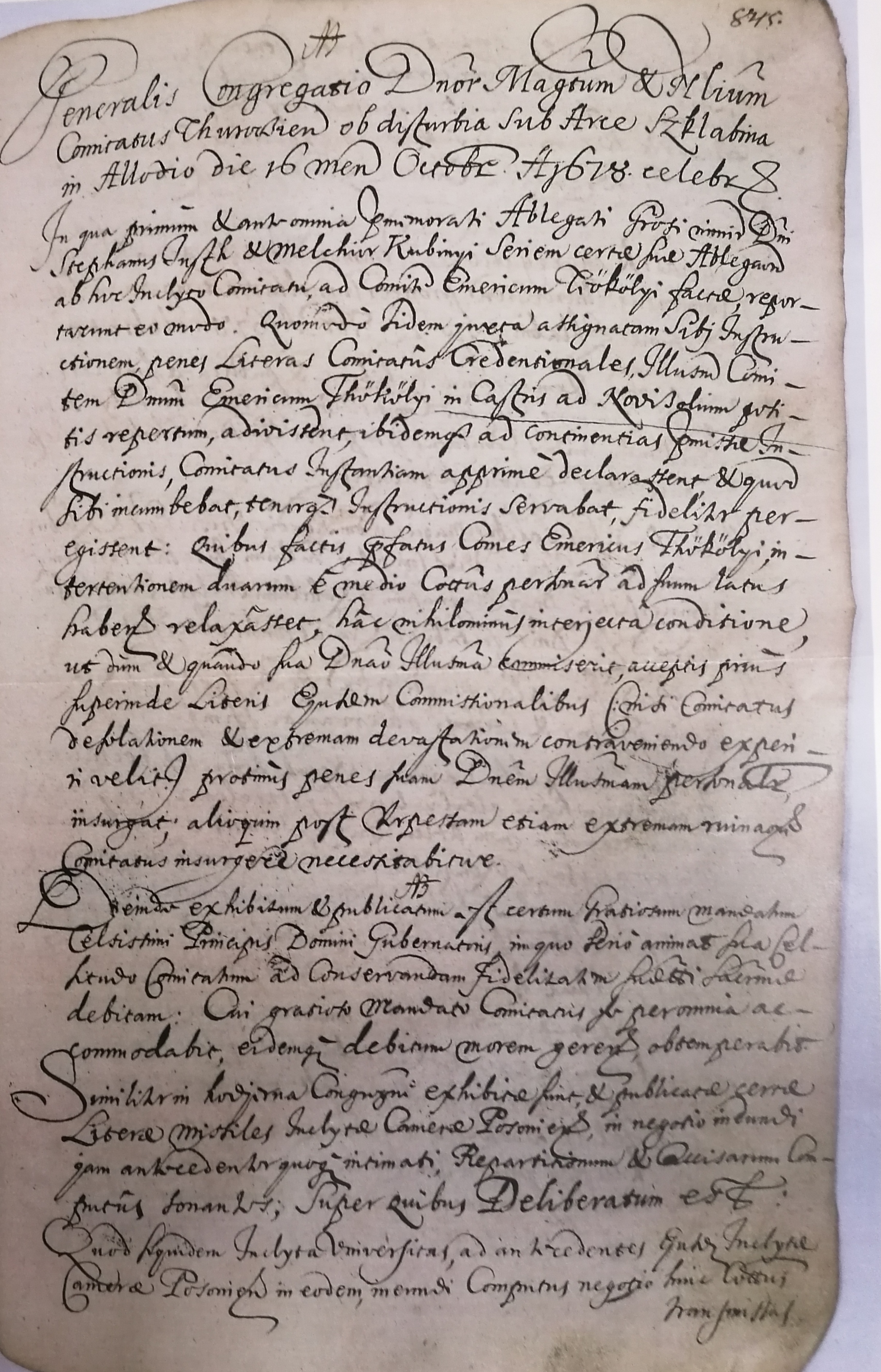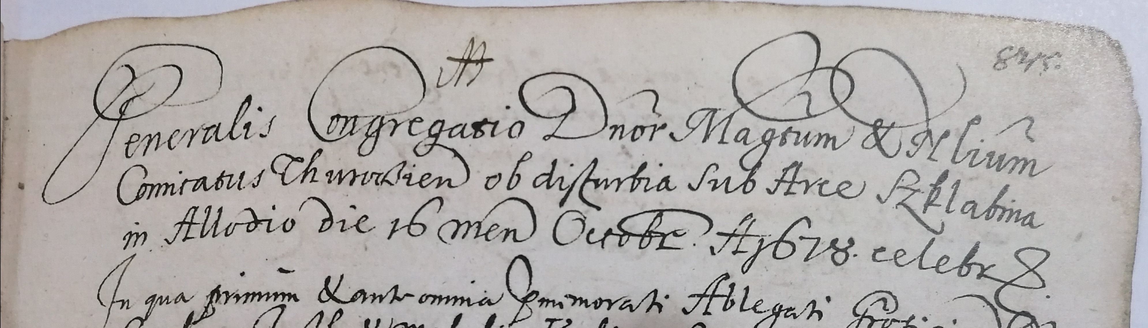 podľa nadpisu išlo o všeobecné zhromaždenie magnátov a urodzených osôb Turčianskej stolice pri príležitosti nepokojov, ktoré sa konalo pod hradom Sklabiňa na panstve dňa 16.10.1678.