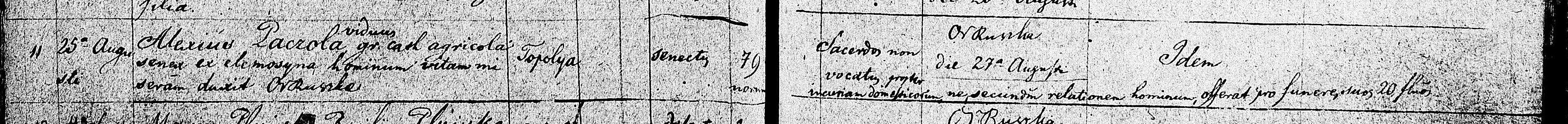 v matrike sa píše: „Alexius Paczola viduus gr[aeco]cath[olicus] agricola, senex ex elemosyna hominum vitam miseram duxit Or[osz]Ruszke.“
