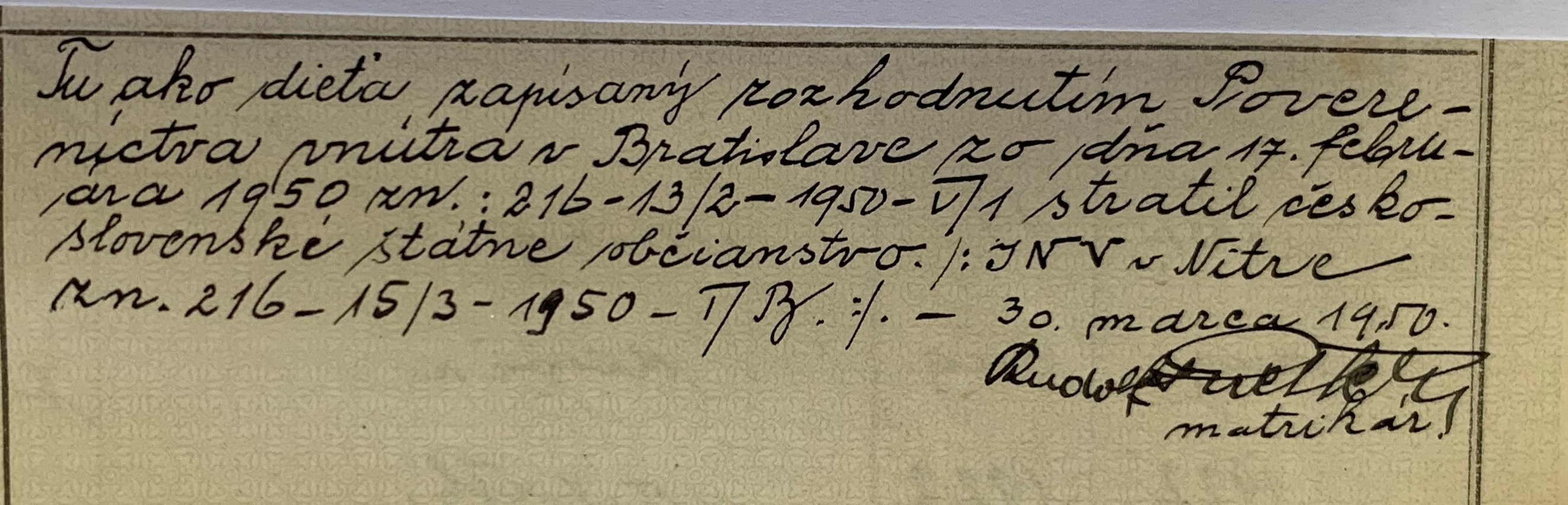 Z poznámky sa odrazím od dátumu 17. február 1950 a straty československého štátneho občianstva. Spolu mi to musí dať výslednicu nejakého vtedy platného zákona. Mne z toho vychádza Zákon na ochranu ľudovodemokratickej republiky č. 231/1948 Zb. https://www.slov-lex.sk/pravne-predpisy ... 81024.html