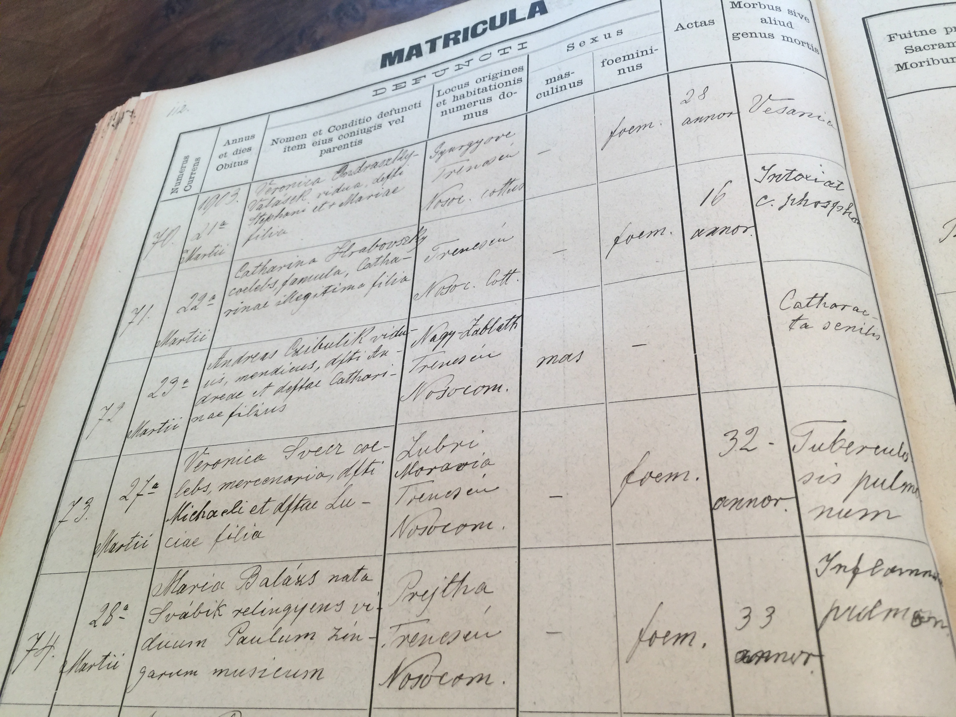 Dobrý deň, chcela by som poprosiť o skontrolovanie prekladu z matriky zosnulých 1903, Trenčín (záznam č.74, 5. riadok zhora):