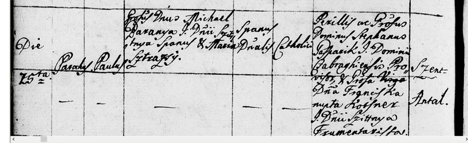 Uzasne, som Vam prevelmi vdacna za preklad. Aj ked som nasla jednotlive preklady niektorych slov, nedalo mi to ziaden vyznam. Snimok matriky mam z tej istej stranky ktoru ste mi podali... Skladam rodinu dokopy vo Svatom Antone teraz a prave pri tomto Baranyovi sa objavuje najviac popisu, tak som chcela vediet co to bol za cloveka. Michaelovi sa narodili 3 deti v Antone ale nasla dom este jedno dieta ktore sa narodilo predtym v Cebradsky Vrbovok (nie su dostupne matriky, iba odpis). Utkvela som pri hladani Michaela, neviem ako dalej pokracovat kedze som si nie ista ci Michael pochdzal z Cebradsky Vrbovok alebo tam iba chvilu posobil. Jeho manzilkine meno "Sztrazsiy" sa skoro vobec nevyskytuje pri hladani... Ako pokracovat?