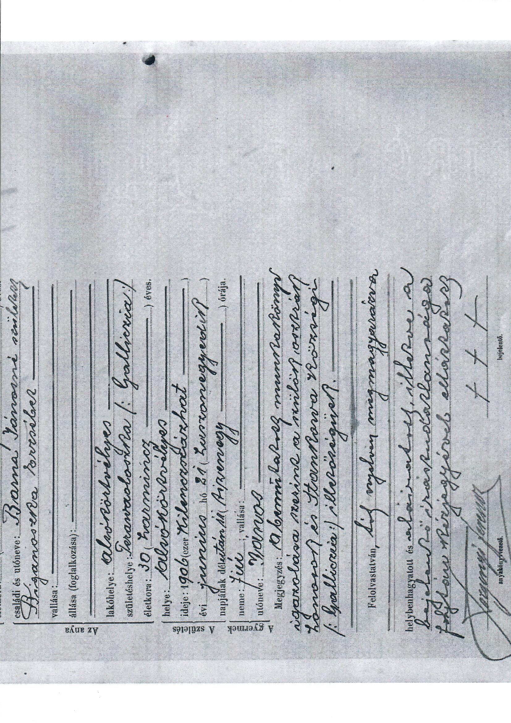 4.szȕletéshelye/miesto narodenia Terawasloszka / Galliczia ......?? / Halič (prvé písmeno je asi T)