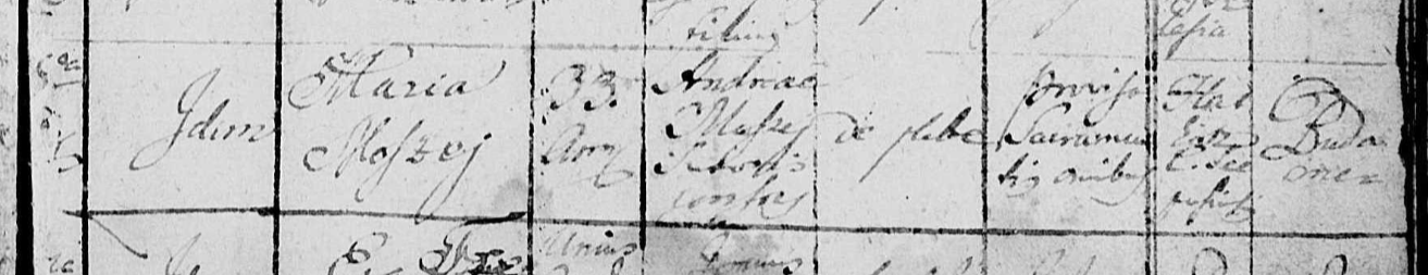 Andrej Mosej, spolu so ženou Máriou prišli (pravdepodobne) do obce Budimír pri Košiciach niekedy pred rokom 1830. Mária zomrela podľa záznamu z úmrtnej matriky v Budimíre vo svojich 33 rokoch. Záznam však obsahuje aj údaj o mieste pôvodu Hatkacz??? a zrejme popis Spišská župa??? čo by teoreticky mohli byť Hotkovce, súčasná Žehra.