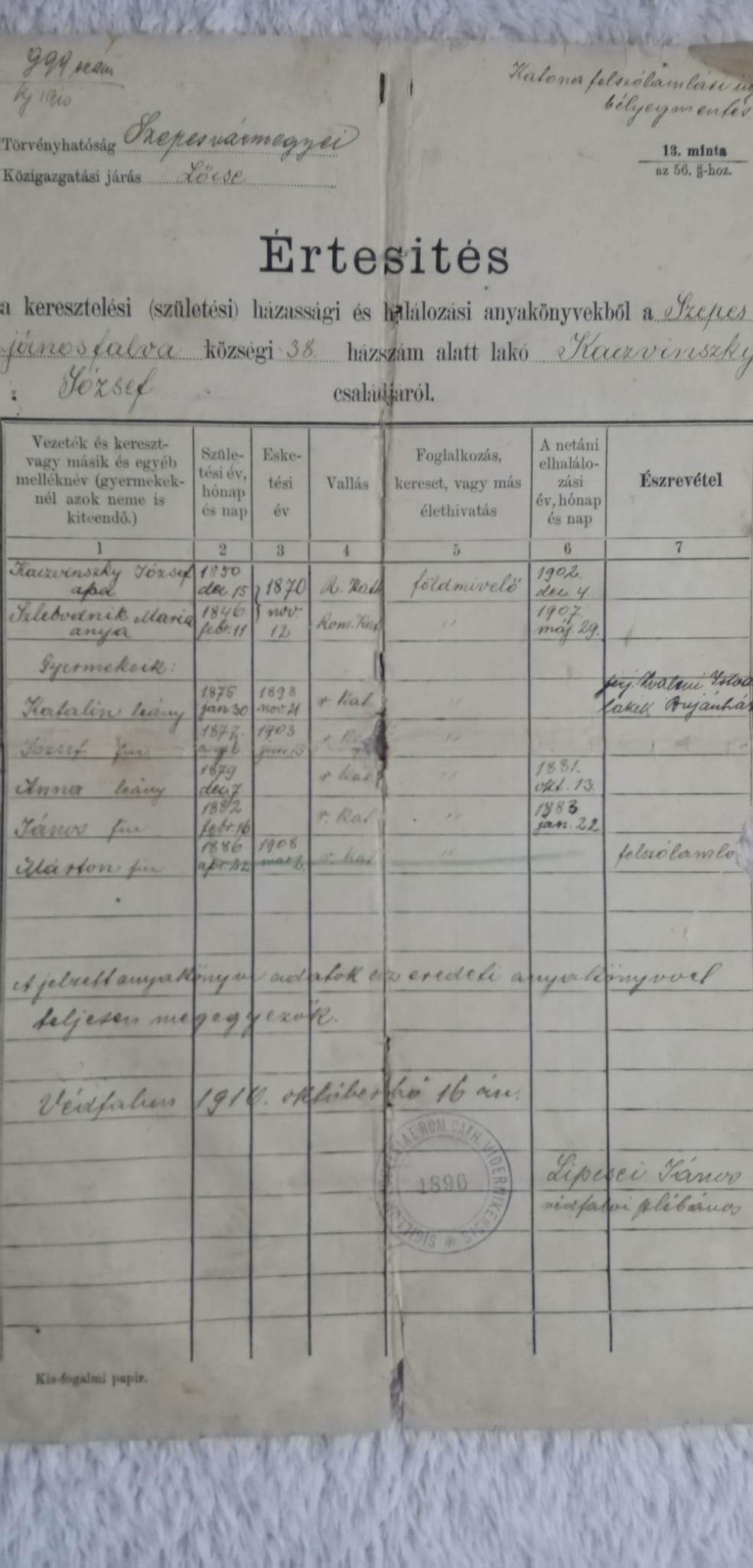 Potvrdenie o narodení Kataríny Kacvinskej dňa 11.5.1911, rodičia ako vyššie uvedení.