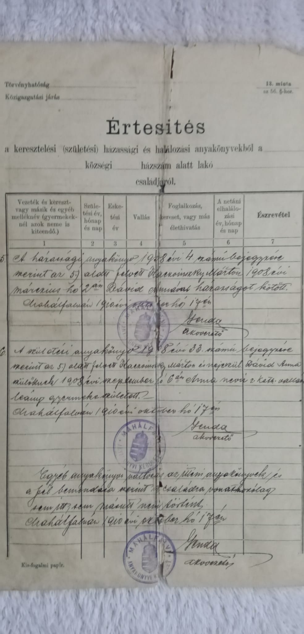 Potvrdenie o narodení Anny Kacvinskej, dcéry horeuvedených manželov dňa 6.9.1908
