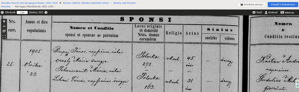 Prosím o radu, pri pátraní v knihe sobášov som našiel zápis, ktorý mi nedáva zmysel. Meno ženícha je Dupej János, ak som správne pochopil jeho matka je Mária Vezely, otec neuvedený, meno nevesty Pohancsaník Mária, meno jej otca Lihan Tamás, meno matky neuvedené. Nechápem prečo nevesta je Pohančaníková a jej otec Lihan,. Alebo som si to zle preložil? Ďakujem za odpoveď.