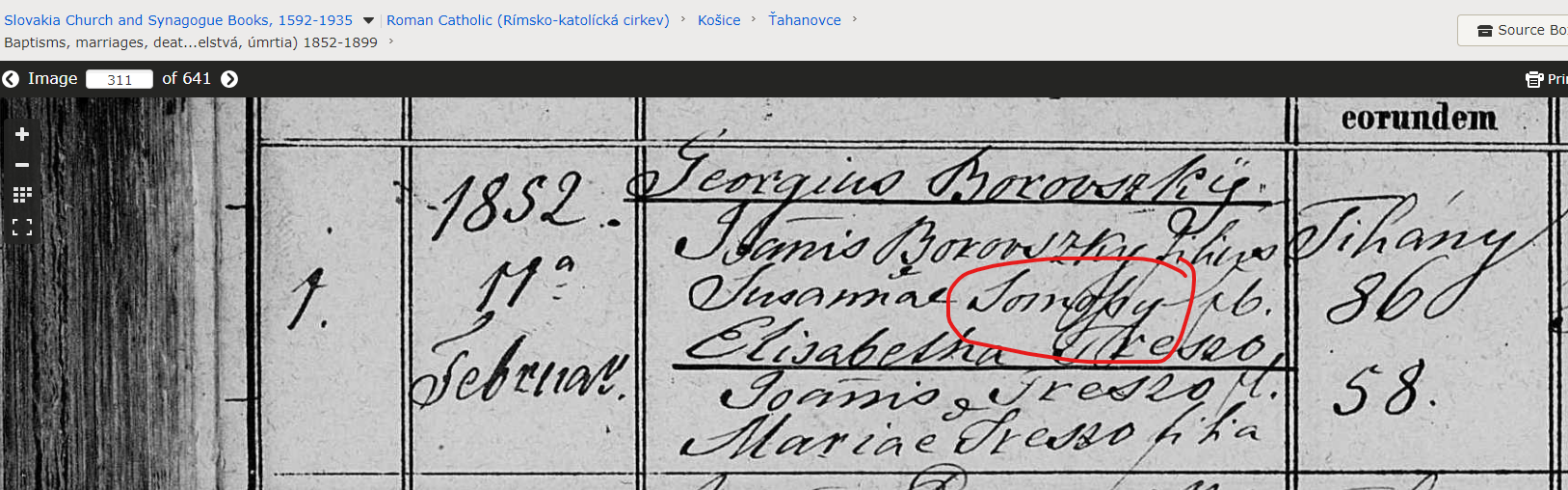 Strana 311/641 na FamilySearch v matrike sobasov pre obec Tahanovce pri Kosiciach.