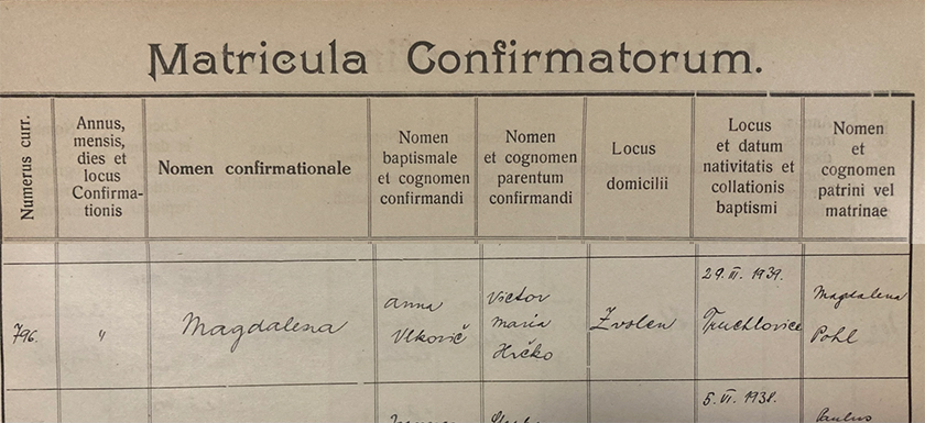 - Z jakého důvodu v matrice biřmovaných v kolonce jména a příjmení rodičů biřmovance (Nomen et cognomen parentum confirmandi) je jakýsi „Victor a Maria Hrčko.“, i když rodiče byli Viktor a Marie Vlkovičovi. Myslíte, že se může jednat o pěstouny, kteří měli shodou okolností stejná křestní jména jako biologičtí rodiče? Problém je, že žádného Viktora s příjmením Hrčko nemohu ve sčítacích hárkov pro rok 1930 ani 1940 najít. Neexistoval kupříkladu nějaký jiný důvod, proč by třeba biologickým rodičům změnili příjmení? (vyřešeno v tom smyslu, že se nejpravděpodobněji jedná o alias - dívčí jméno matky Anny Vlkovičové - zkomolené z Krcho na Hrčko)