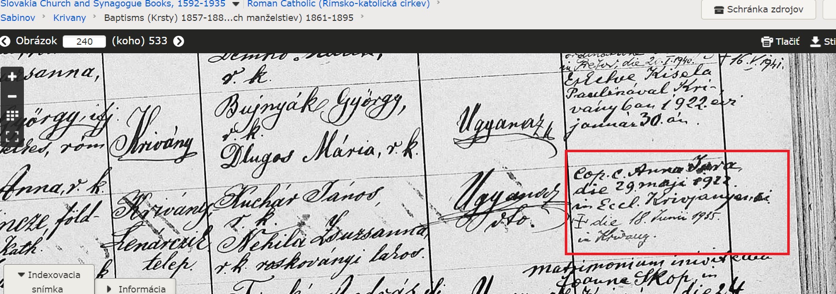 Predpokladám, že ide o záznam z krstu chlapca.Bibiana760 napísal: 31 Mar 2024, 10:11 čiže dátum 29.maj 1922 je sobáš s Anna Jura alebo úmrtie Anna Jura?